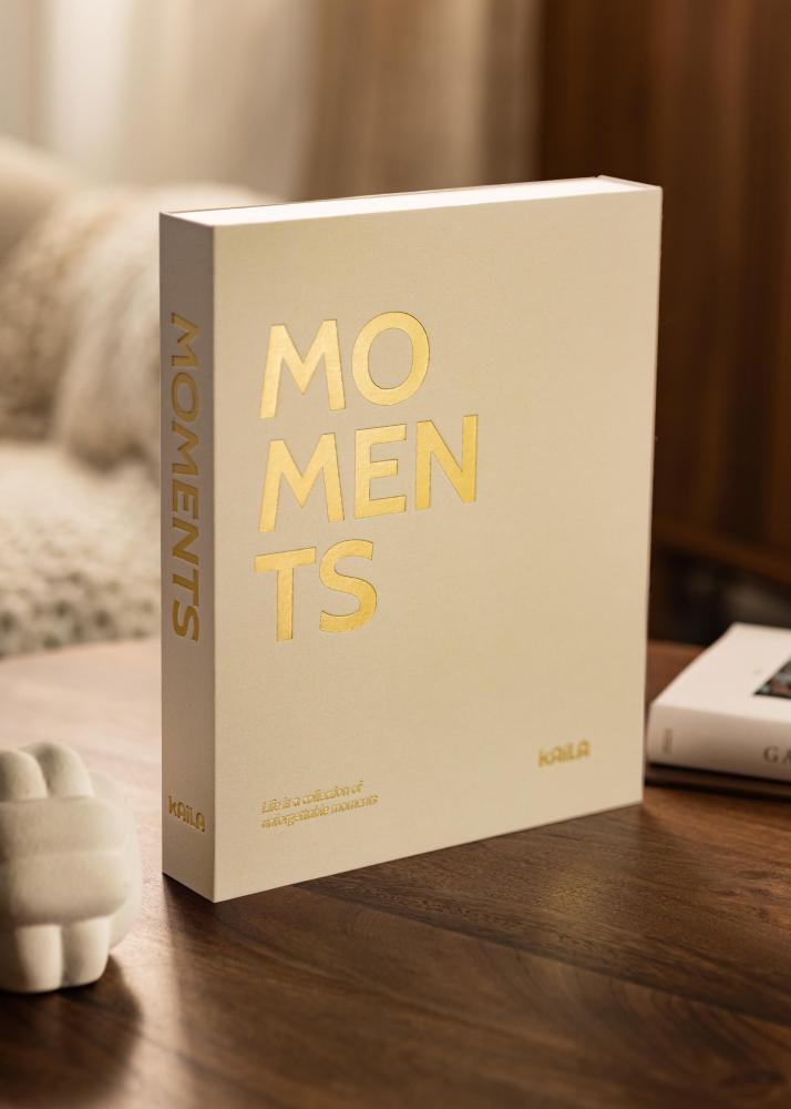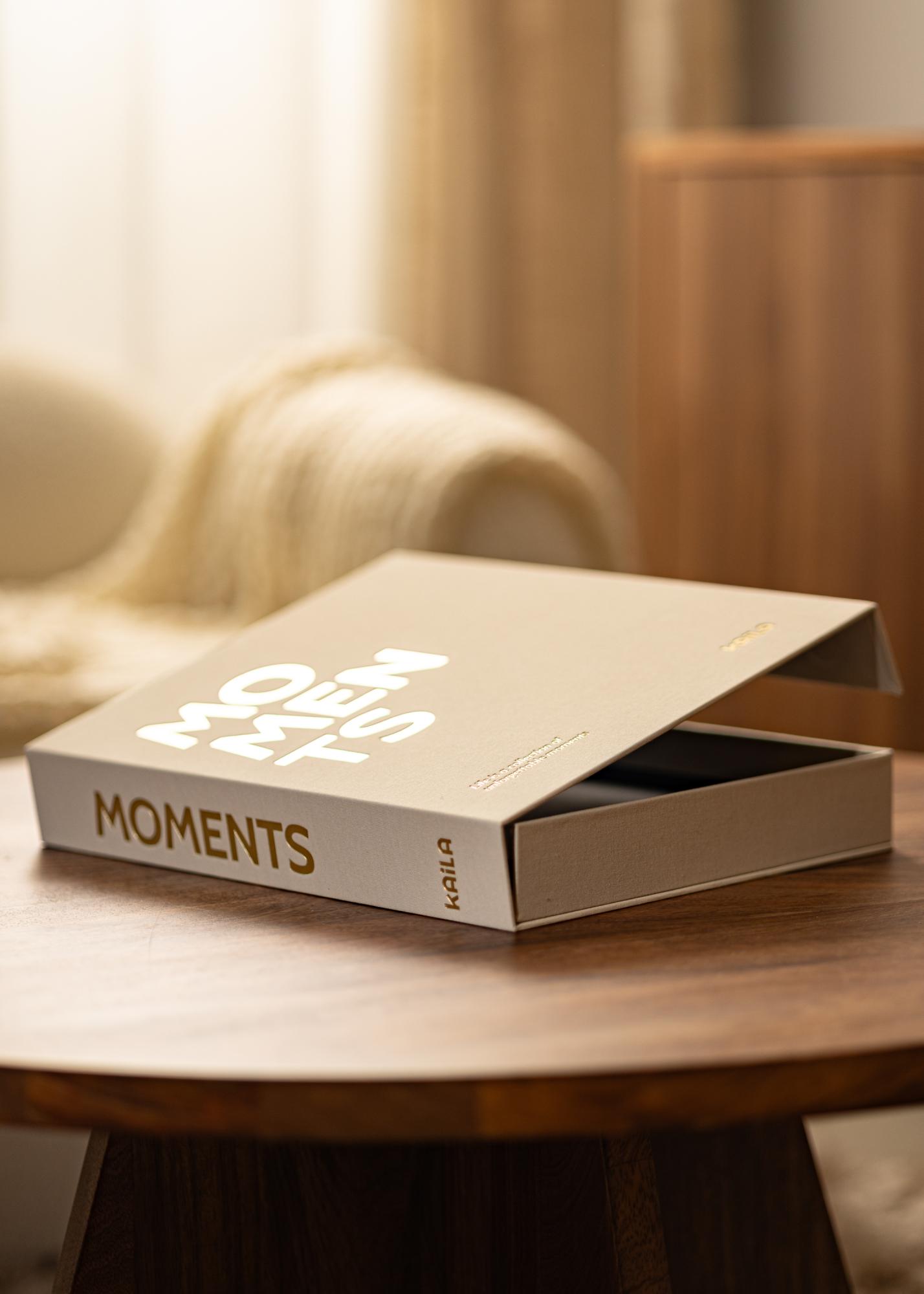 Fotoalbumas yra sukurtas kaip dėžutė, kurią galite atidaryti, kad būtų lengviau pasiekti nuotraukas. Viršelis yra puoštas kreminės spalvos tekstile, suteikiančia prabangos jausmą. Priekiniame ir šoniniame puslapiuose yra užrašas „MOMENTS“. Kairiajame viršutiniame kampe matomas gražus antraštinis užrašas „Life is a collection of unforgettable moments“.