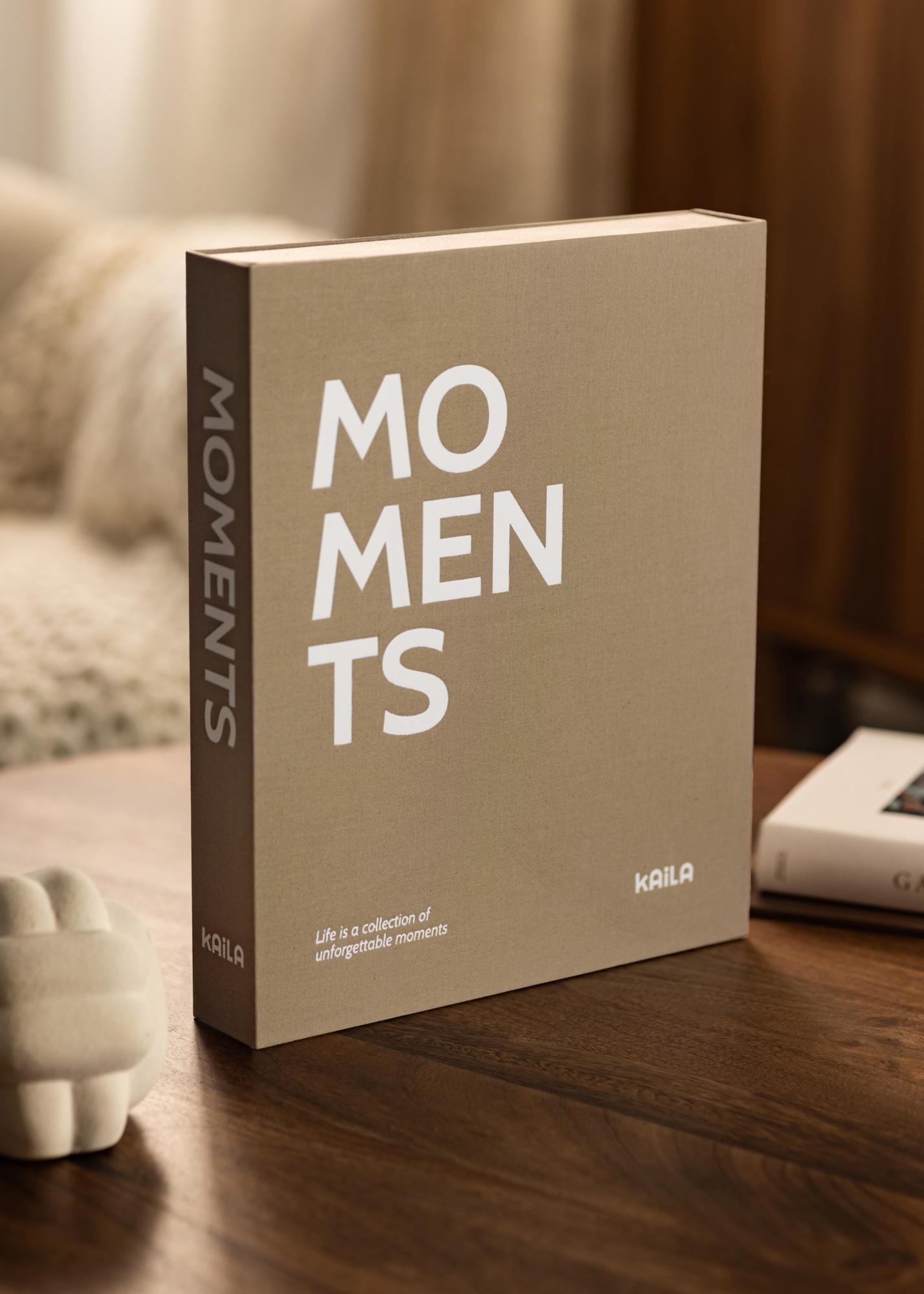 Fotoalbumas yra suprojektuotas kaip dėžutė, kurią galite atidaryti norėdami pasiekti savo nuotraukas. Viršelis dekoruotas pilka tekstile, kuri suteikia prabangos jausmą. Priekyje ir šone yra tekstas „MOMENTS“. Viršutinio kairiojo kampo apačioje matomas gražus poskyris „Life is a collection of unforgettable moments“.