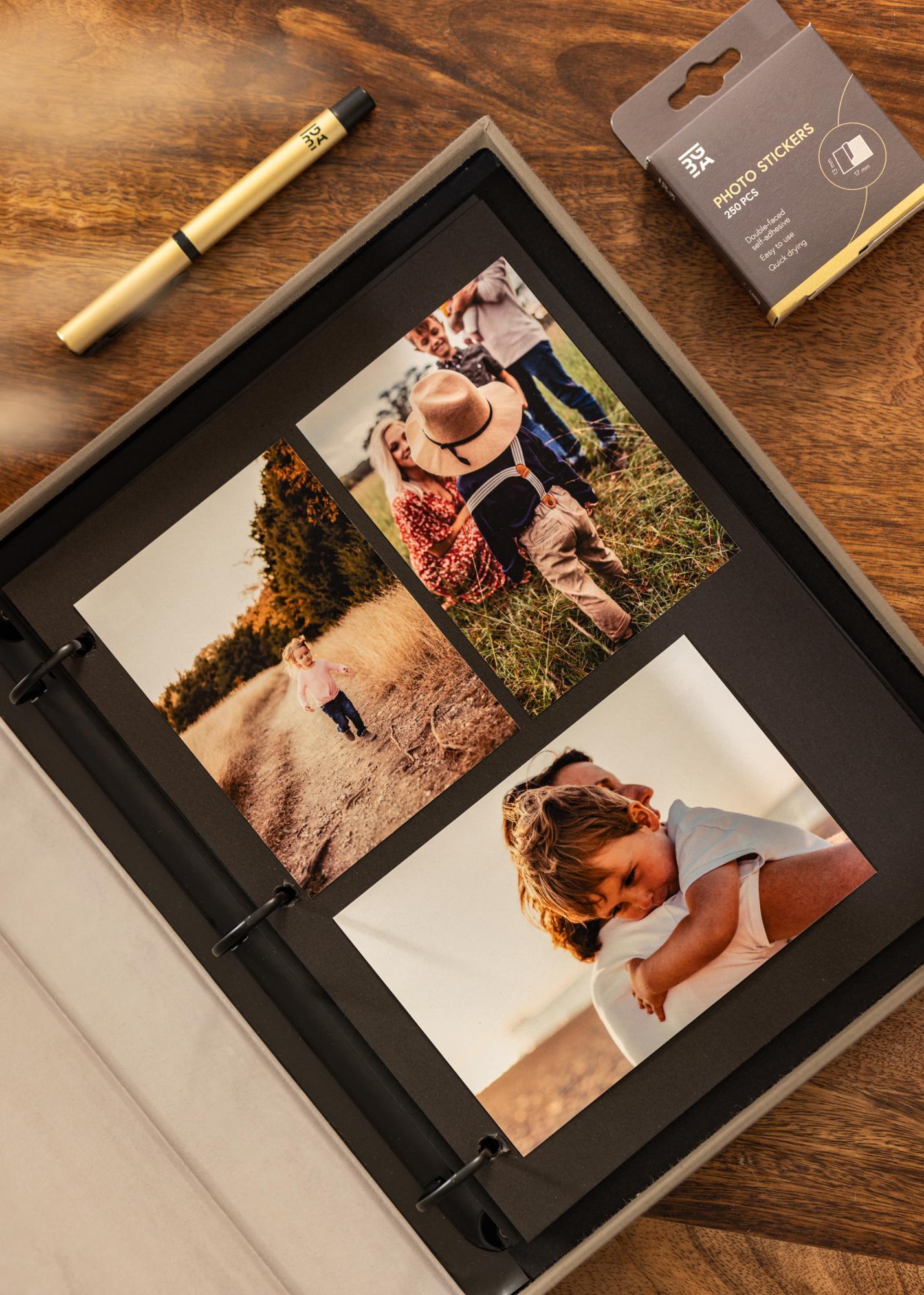 Tai yra fotoalbumas jums, norintiems išsaugoti geriausius savo fotoatsiminimus su stiliumi! Albumas sukurtas kaip stilinga žurnalinė knyga, kurią galima naudoti kaip dekoraciją jūsų namų skryniose ir staleliuose. Albumo viduje yra žiedinė segtuvė su 60 juodų puslapių (30 lapų), kuriuos galite užpildyti savo gražiausiomis nuotraukomis. Patys klijuokite nuotraukas į albumą, todėl galite būti kūrybingi ir derinti skirtingo formato ir dydžio nuotraukas.