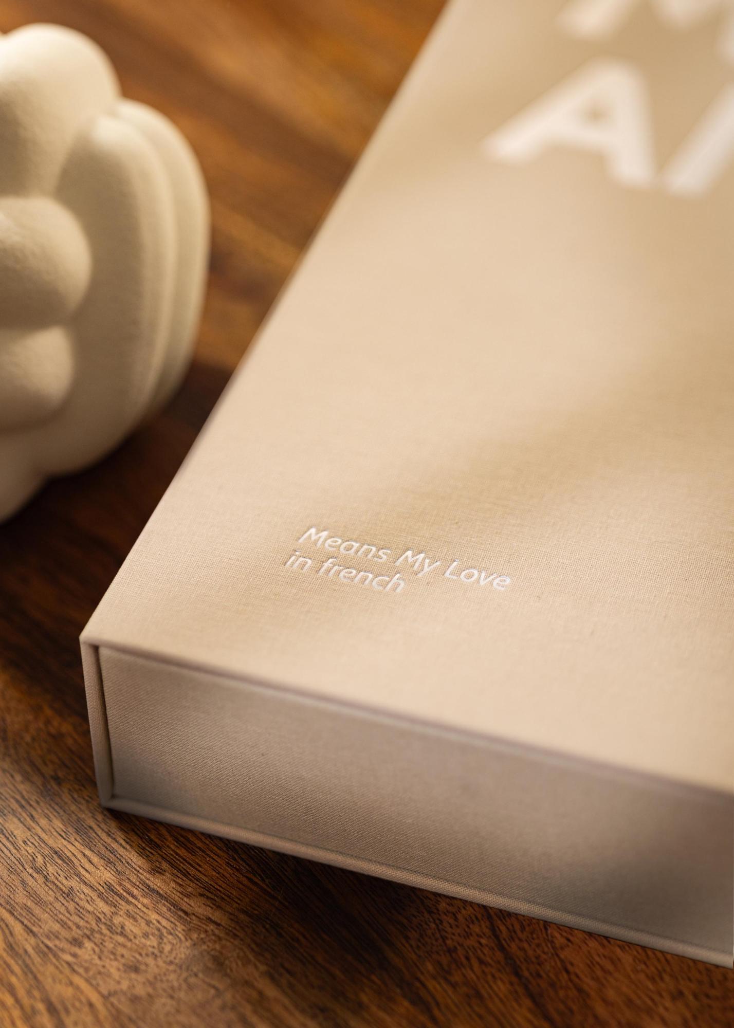 Ar norėtumėte modernaus fotoalbumo, kuris būtų prabangiu jūsų namų interjero elementu? Tuomet šis Coffee Table Album yra kaip tik jums! Albumas sukurtas kaip maža dėžutė su išskirtiniu smėlio spalvos tekstilės viršeliu. Albumo pavadinimas „MON AMOUR“ suteikia romantišką akcentą minimalistiniam dizainui. Albumo kairiajame kampe yra užrašas „Means My Love in French“.