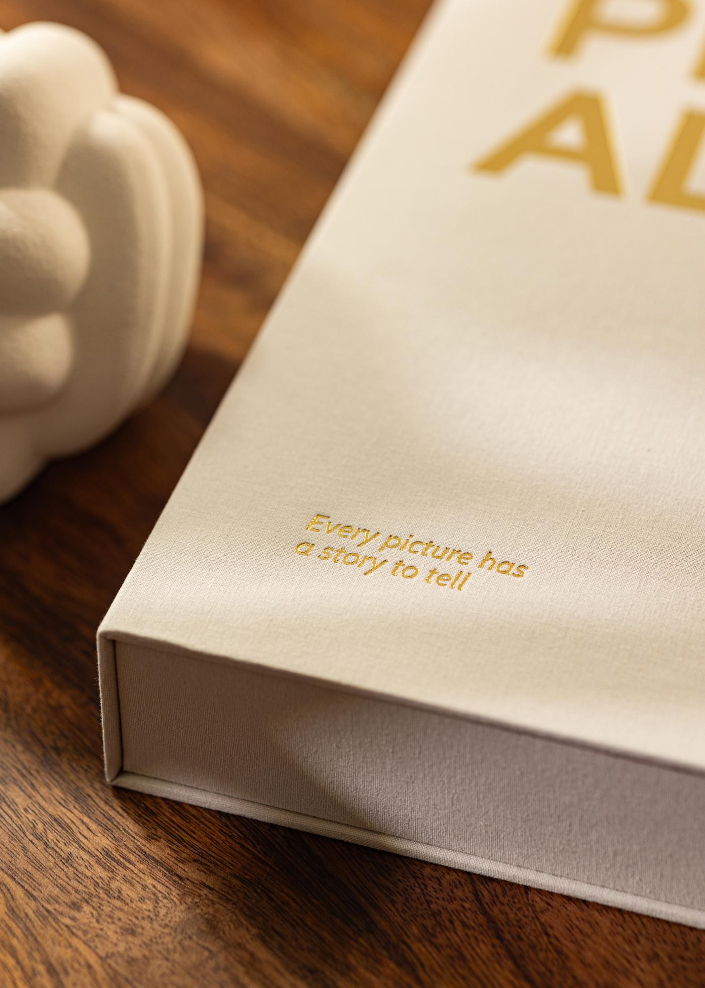 Tai yra fotoalbumas jums, jei ieškote albumo, kuriame tilptų jūsų gražiausios nuotraukų prisiminimai ir kuris tuo pačiu atrodytų puikiai ant stalo. Albumas yra sukurtas kaip Coffee Table Book, su moderniu dizainu, kuris tampa akivaizdžia dekoracija ant svetainės stalo ar knygų lentynoje. Jis sukurtas kaip išskirtinė dėžutė, kurios apvalkalas yra elegantiškos grietinėlės spalvos tekstilė. Atidarius albumą, jūs rasite žiedinę segtuvę su 60 juodų albumo puslapių (30 lapų), kuriuos galite užpildyti nuotraukomis iš gražių akimirkų. Jūs patys klijuojate nuotraukas ten, kur norite.