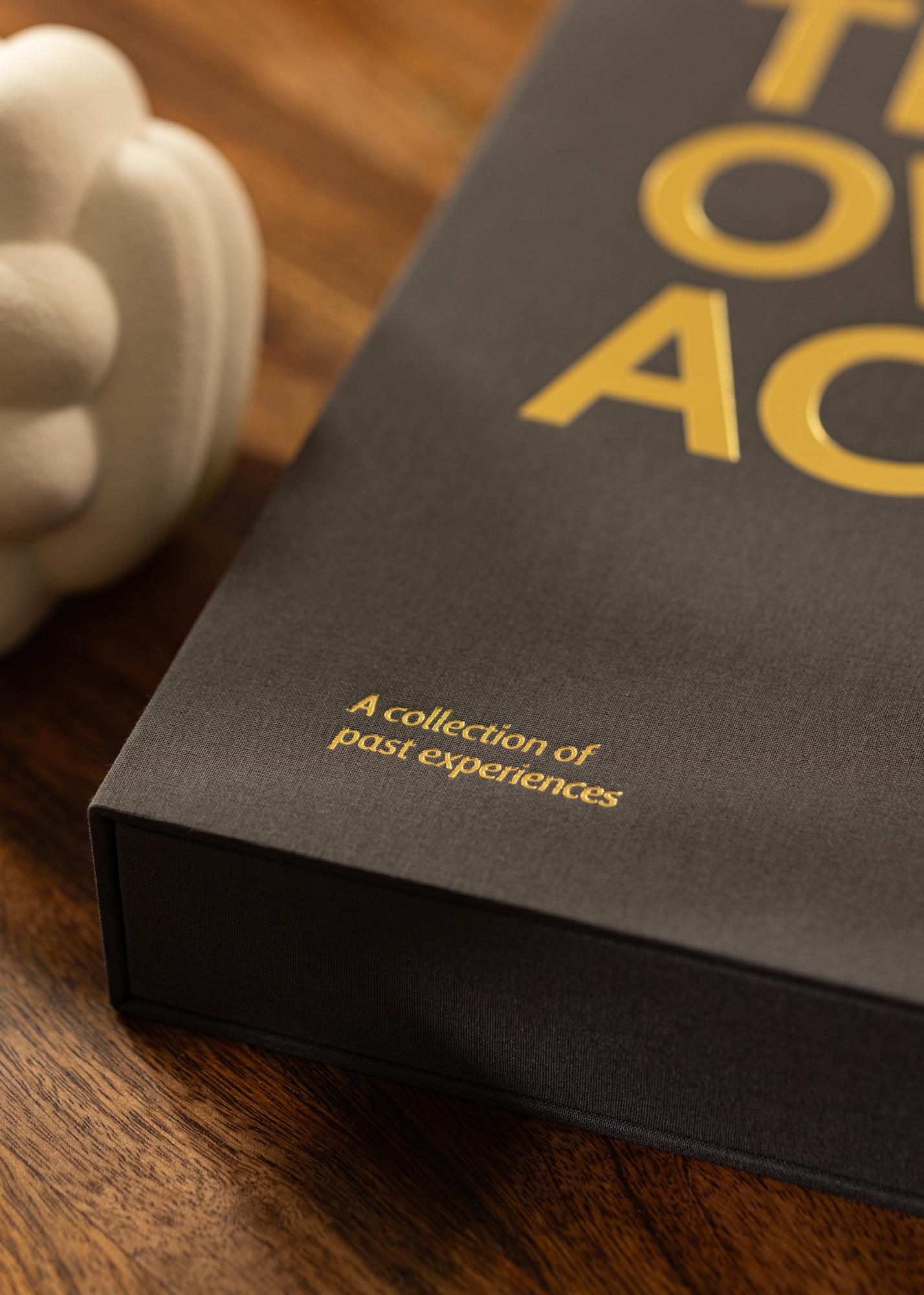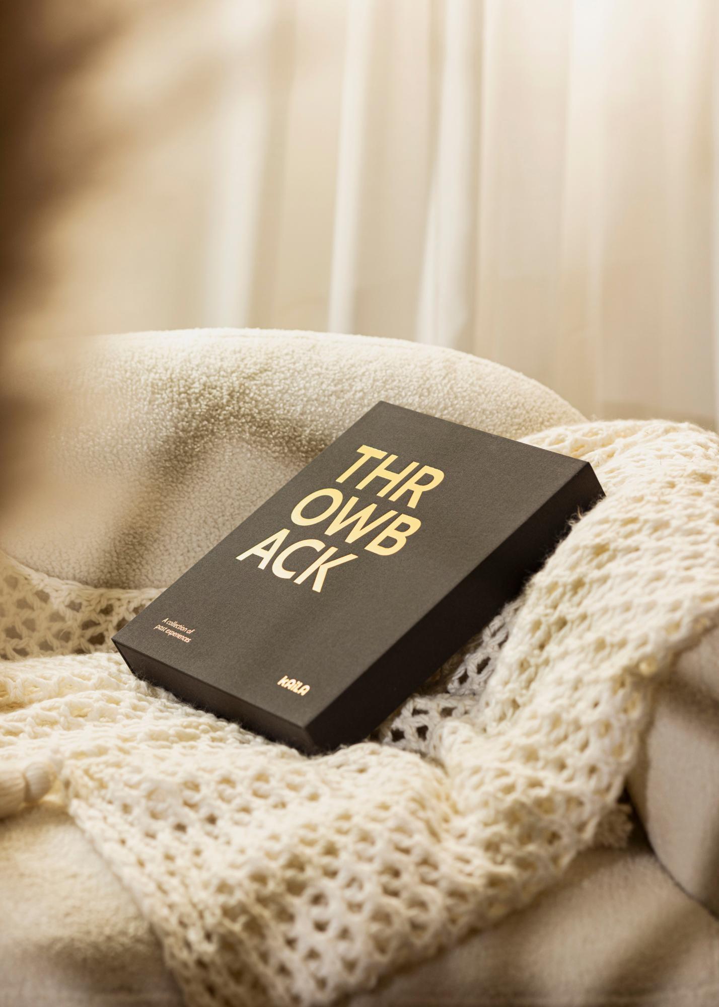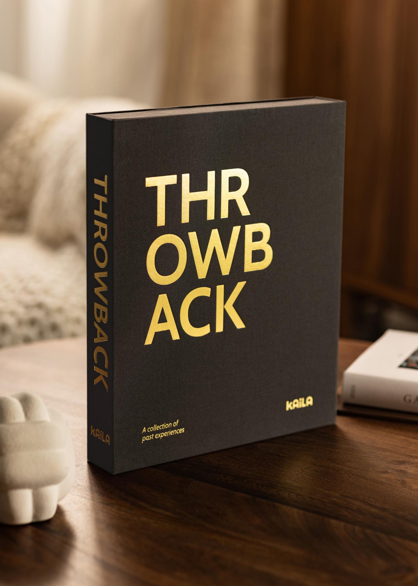 Šis yra labai madingas fotoalbumas, kuris prabangiai supakuotas kaip stilinga kavos staliuko knyga - vadinamas Coffee Table Photo Album. Fotoalbumas yra sukurtas kaip išskirtinė dėžutė, kurią atidarote, norint pasiekti turinį. Viršelis elegantiškai aptrauktas juodu tekstilu ir papuoštas auksinės spalvos užrašu „THROWBACK“, kuris puošia priekinį dangtelį ir albumo nugarėlę. Ši pažįstama sąvoka, reiškianti prisiminimų atkūrimą, suteikia fotoalbumui modernų ir šiek tiek įžūlų pojūtį, jiehe jis tikrai išsiskiria iš klasikinių albumo stilių. Albumas taip pat turi antraštę „A collection of past experiences“, kuri yra atspausdinta apatiniame kairiajame kampe.
