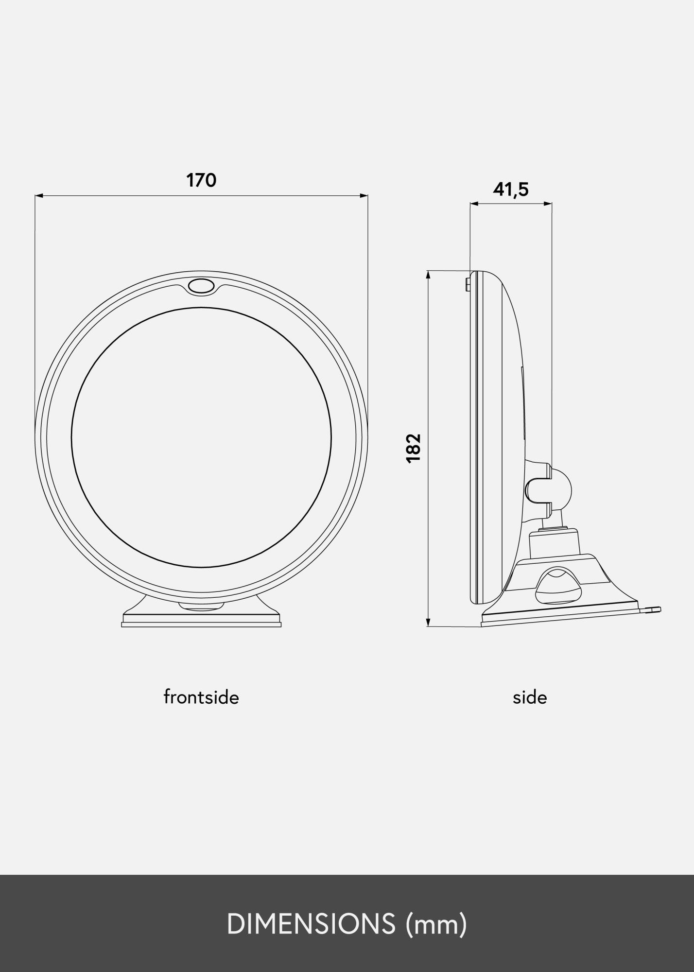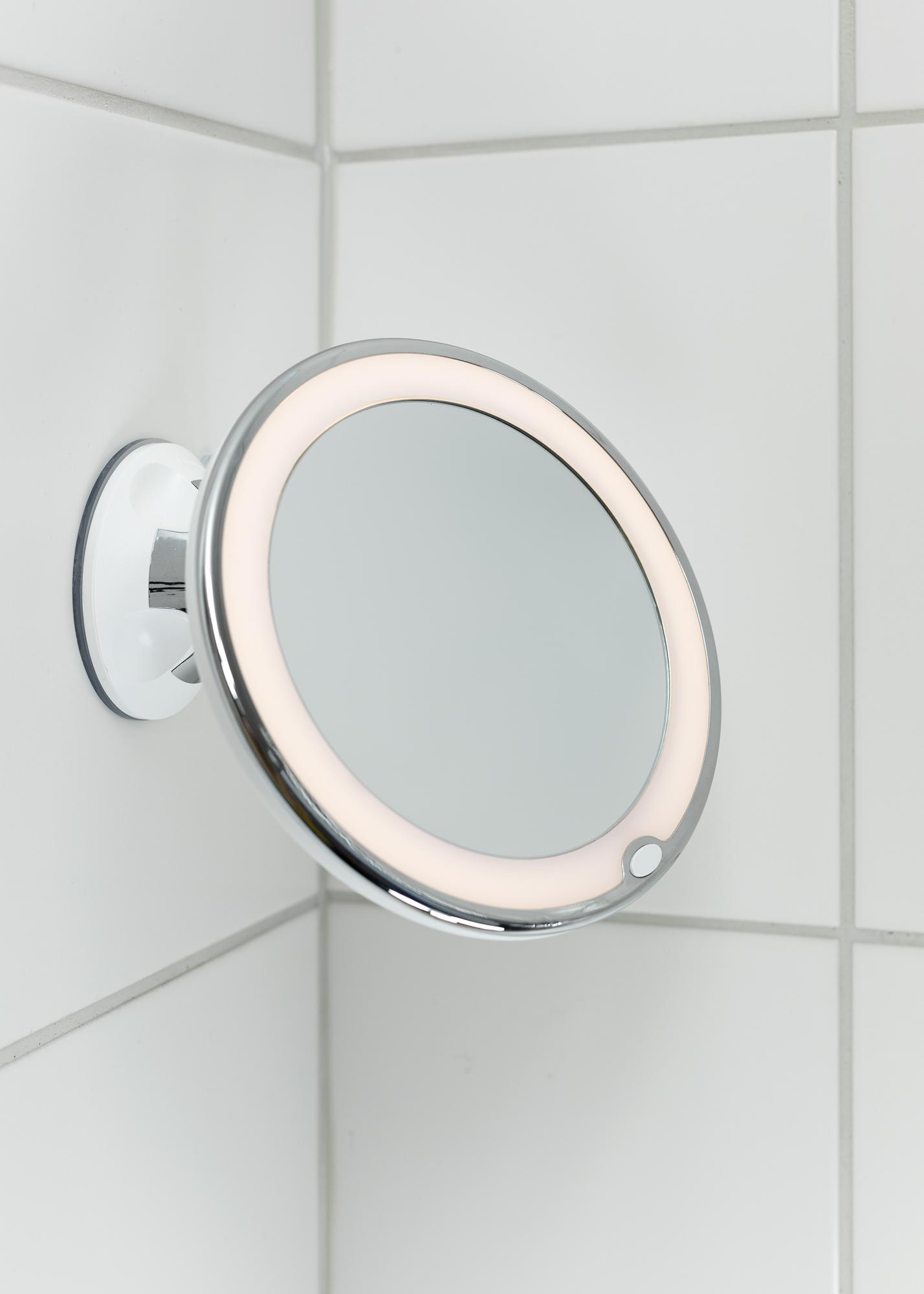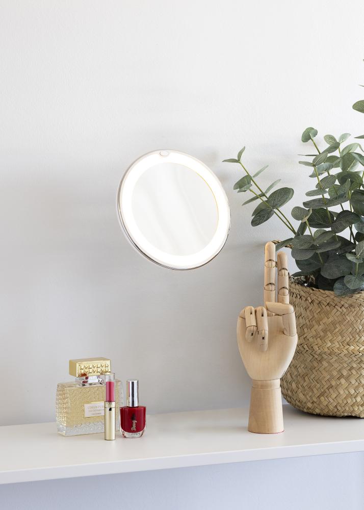 Tai klasikinis KAILA vonios kambario veidrodis su patogiu dizainu. Elegantiškas veidrodis turi integruotą LED apšvietimą, kuris įrėmina veidrodžio stiklą. Vonios kambario veidrodis yra 17 cm skersmens ir turi padidinamąjį veidrožio stiklą su 5 kartų priartinimu. Kitaip tariant, šis veidrodis puikiai tinka aštriam artimajam vaizdui į veidą gauti! Veidrodis yra dekoratyvus interjero elementas, tačiau jo patogus dizainas taip pat leidžia lengvai paslėpti veidrodį, kai jis nenaudojamas. Veidrodis pritvirtinamas prie sienos, plytelių ar stalo su pridedama siurbtuko. Siurbtukas yra užrakinamas, todėl veidrodis stabiliai laikosi. Pristatomas nesumontuotas.