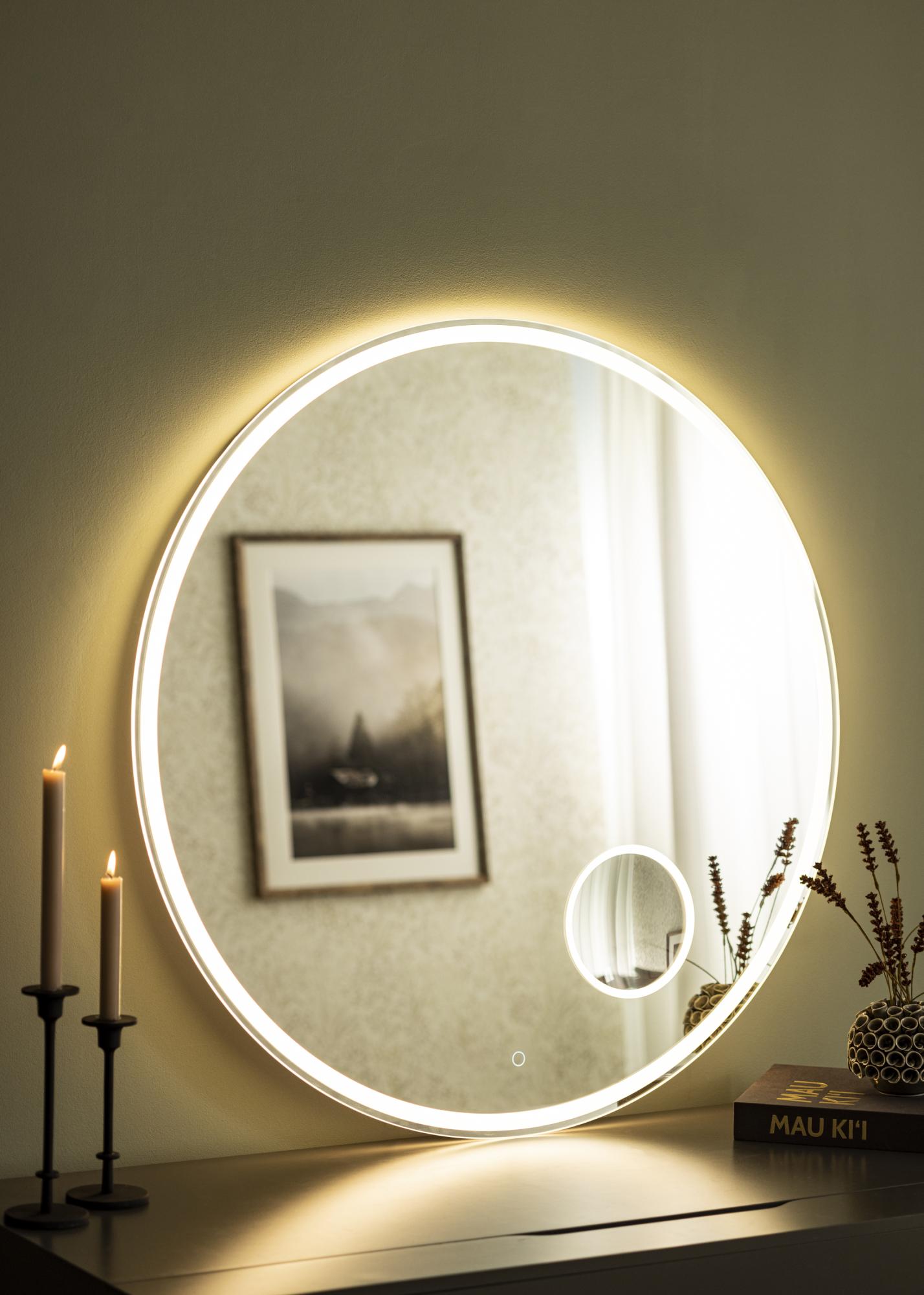 Ieškote stilingo vonios veidrodžio su įmontuotu LED apšvietimu ir priartinimu? Tada šis veidrodis skirtas jums! Veidrodis turi klasikinę apvalią formą ir LED juostą išilgai veidrodžio kraštų. Jis aprūpintas įprastu veidrodiniu stiklu ir turi mažesnį veidrodį su 3 kartus didinimu, taip pat su LED apšvietimu, kuris įrėmina veidrodžio paviršių. Šviesa turi malonų 3000K švytėjimą, kurį lengvai galite pritemdyti nuo 10-100% šviesos intensyvumo. Norėdami reguliuoti šviesos intensyvumą, kelias sekundes palaikykite touch mygtuką veidrodžio apatinėje dalyje.