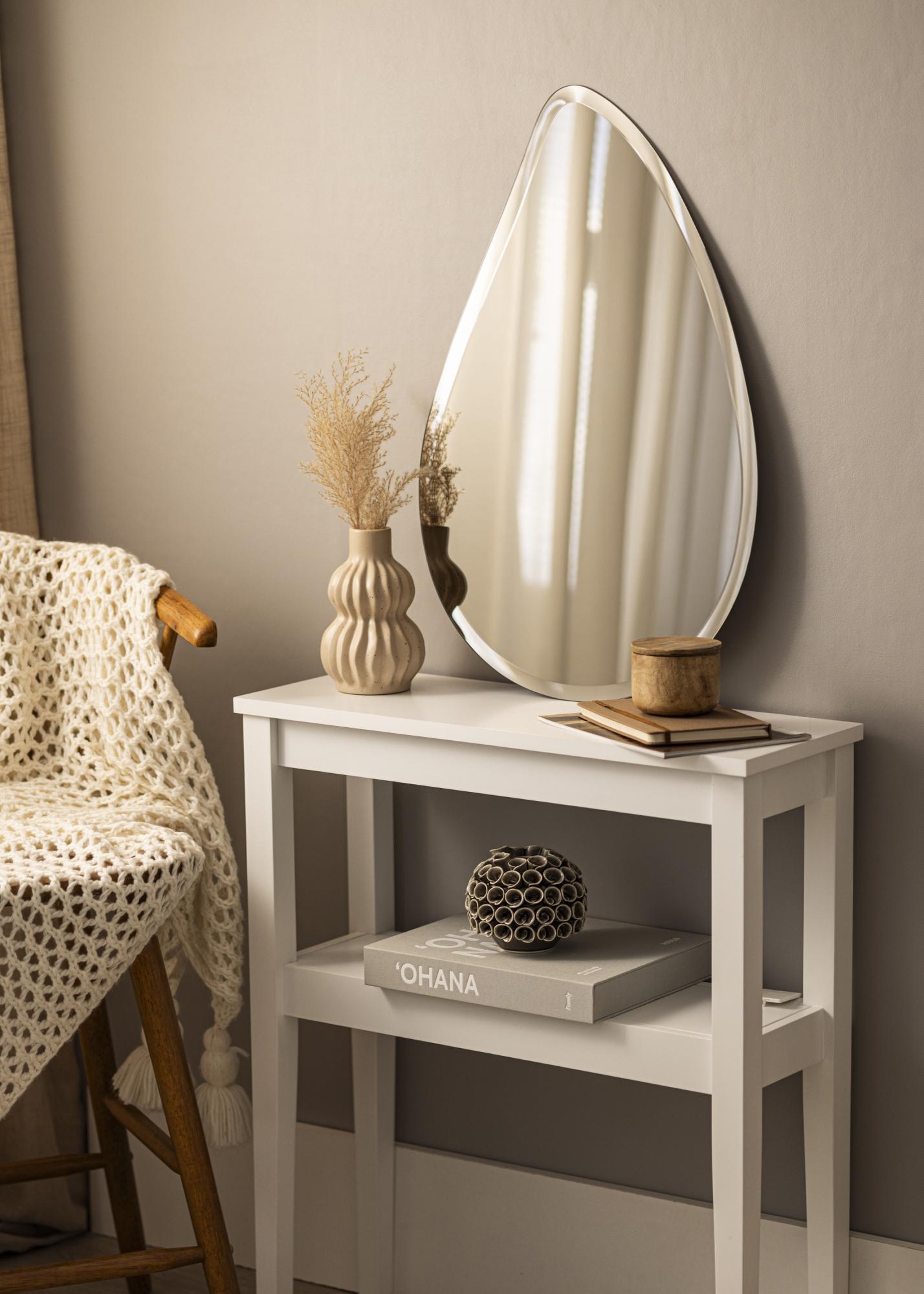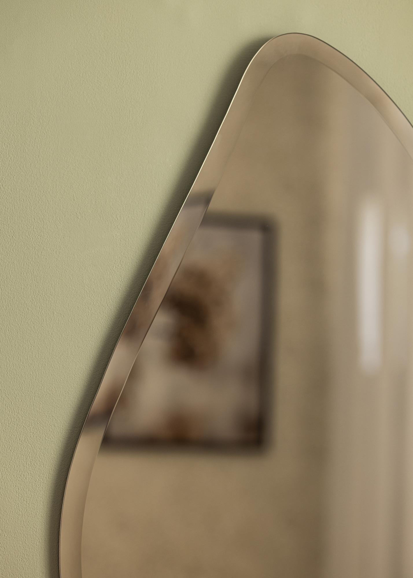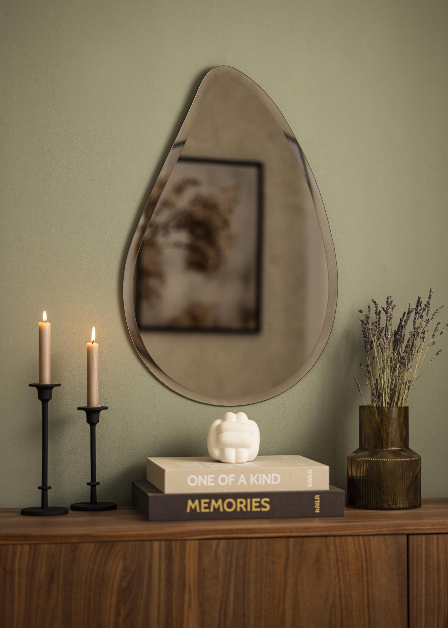 Tai madingas lašo formos veidrodis su dar madingesniu veidrodiniu stiklu, tonuotas elegantišku tamsaus bronzos atspalviu. Tonuotas veidrodinis stiklas suteikia didelį efektą, o graži bronzos spalva lengvai derinama su daugybe skirtingų interjero spalvų schemų. Veidrodis yra labai plonas ir neturi rėmo, o kartu su prabangiai facetuotais kraštais dar labiau pabrėžia elegantų ir modernų įvaizdį. Tai labai dekoratyvinis sieninis veidrodis, kuris tikrai pritraukia dėmesį, nesvarbu, kurioje patalpoje jis bus pastatytas – tiek svetainėje, tiek koridoriuje ar miegamajame.