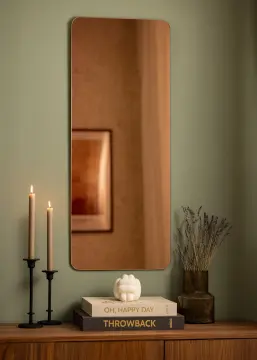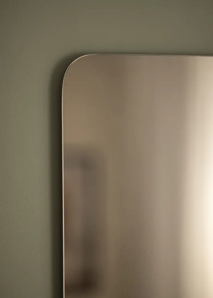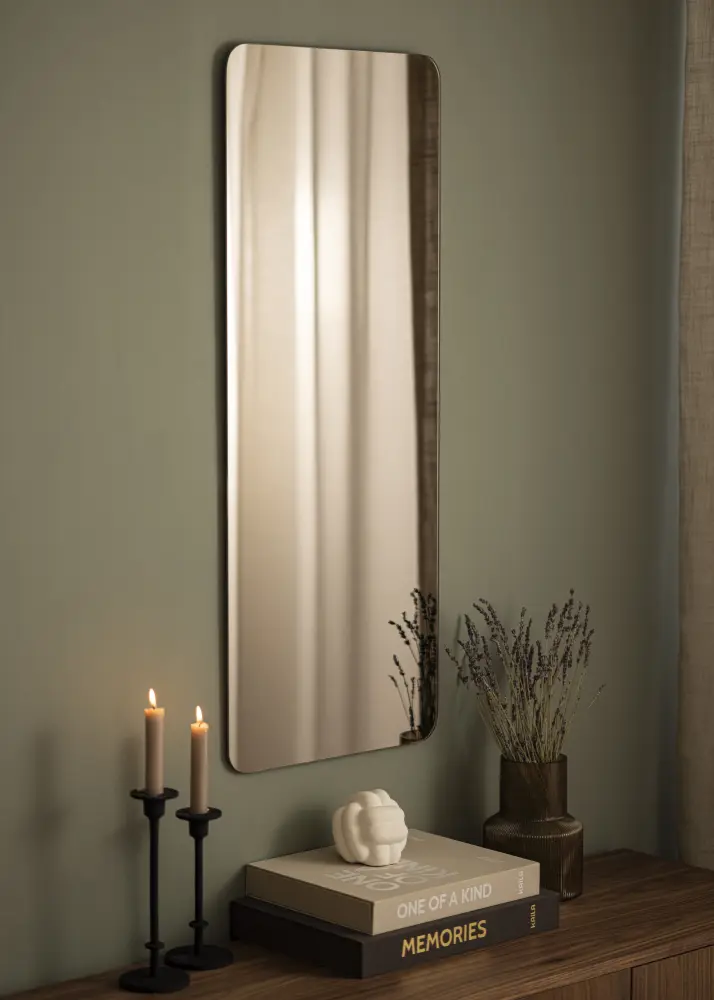 Tai stačiakampis veidrodis su dekoratyviai užapvalintais kampais, suteikiančiais jam švelnų ir elegantišką įspūdį. Veidrodžio stiklas yra tonuotas tamsaus bronzos atspalviu, todėl šis veidrodis tampa įspūdingu ir madingu jūsų namų interjero akcentu. Veidrodis taip pat yra labai plonas ir be rėmo, kas dar labiau prisideda prie jo elegantiško, stilingo pojūčio.