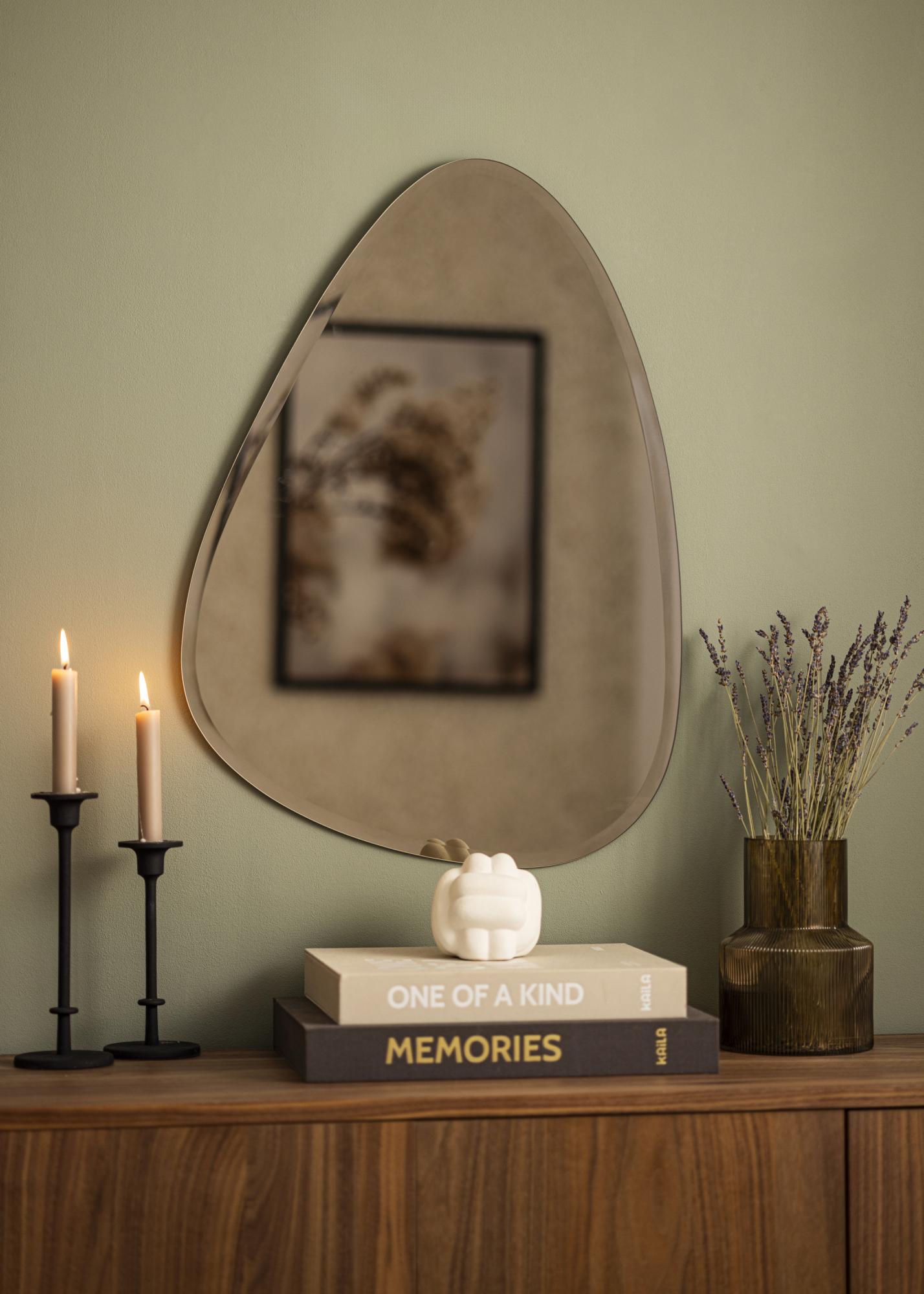 Tai asimetrinis sieninis veidrodis iš KAILA, su moderniu bronzos atspalviu veidrodinio stiklo. Veidrodis su tamsesniu veidrodiniu stiklu tampa dramatiška detale, kuri puikiai tinka moderniuose namuose. Plonas veidrodis neturi rėmo. Vietoj to, veidrodžio kraštai puošti elegantiškai fasuota briauna.