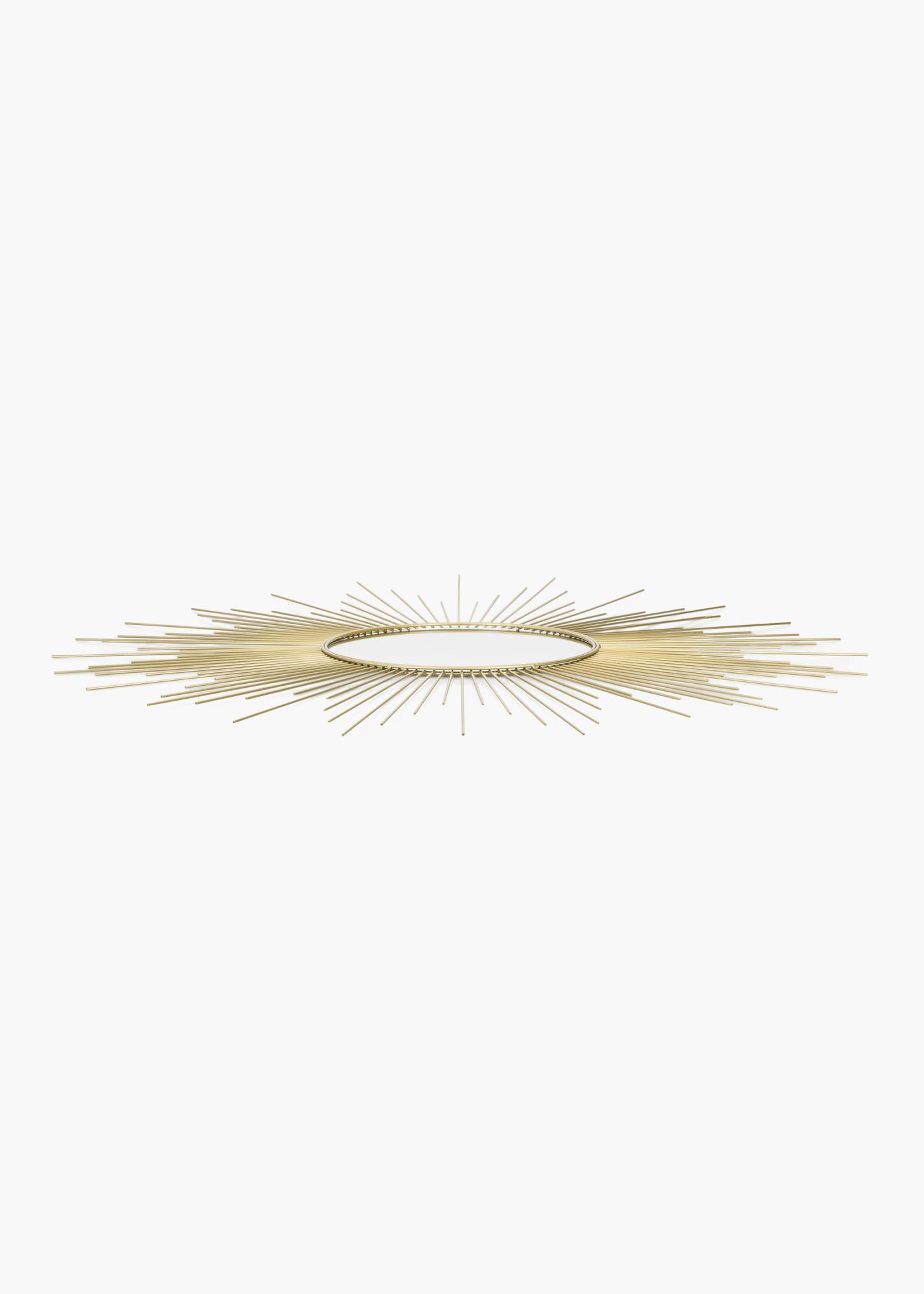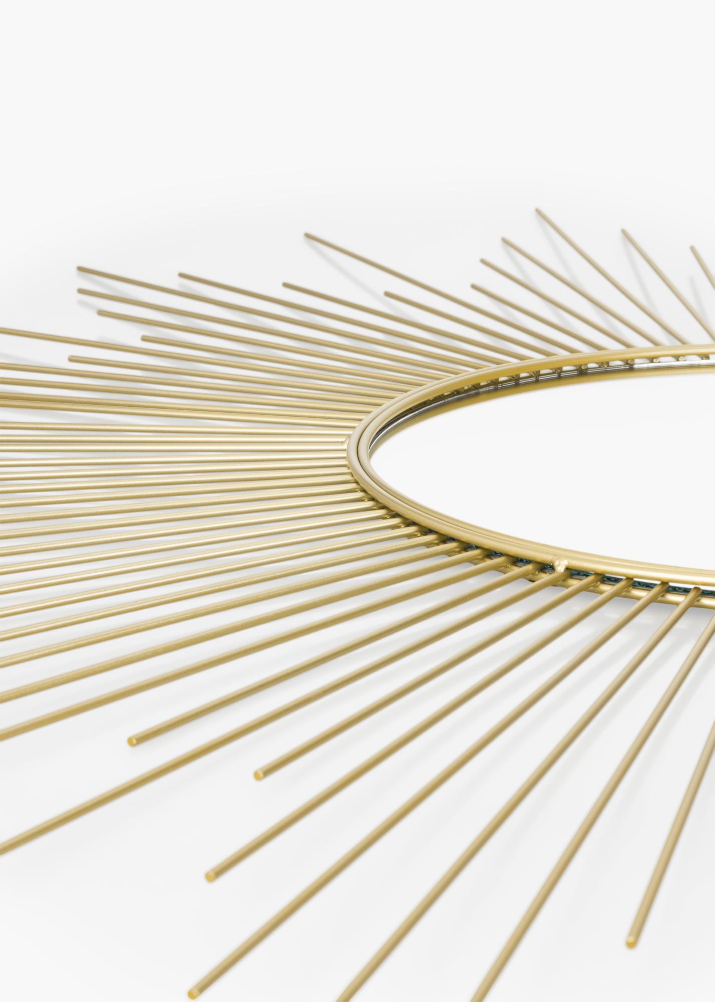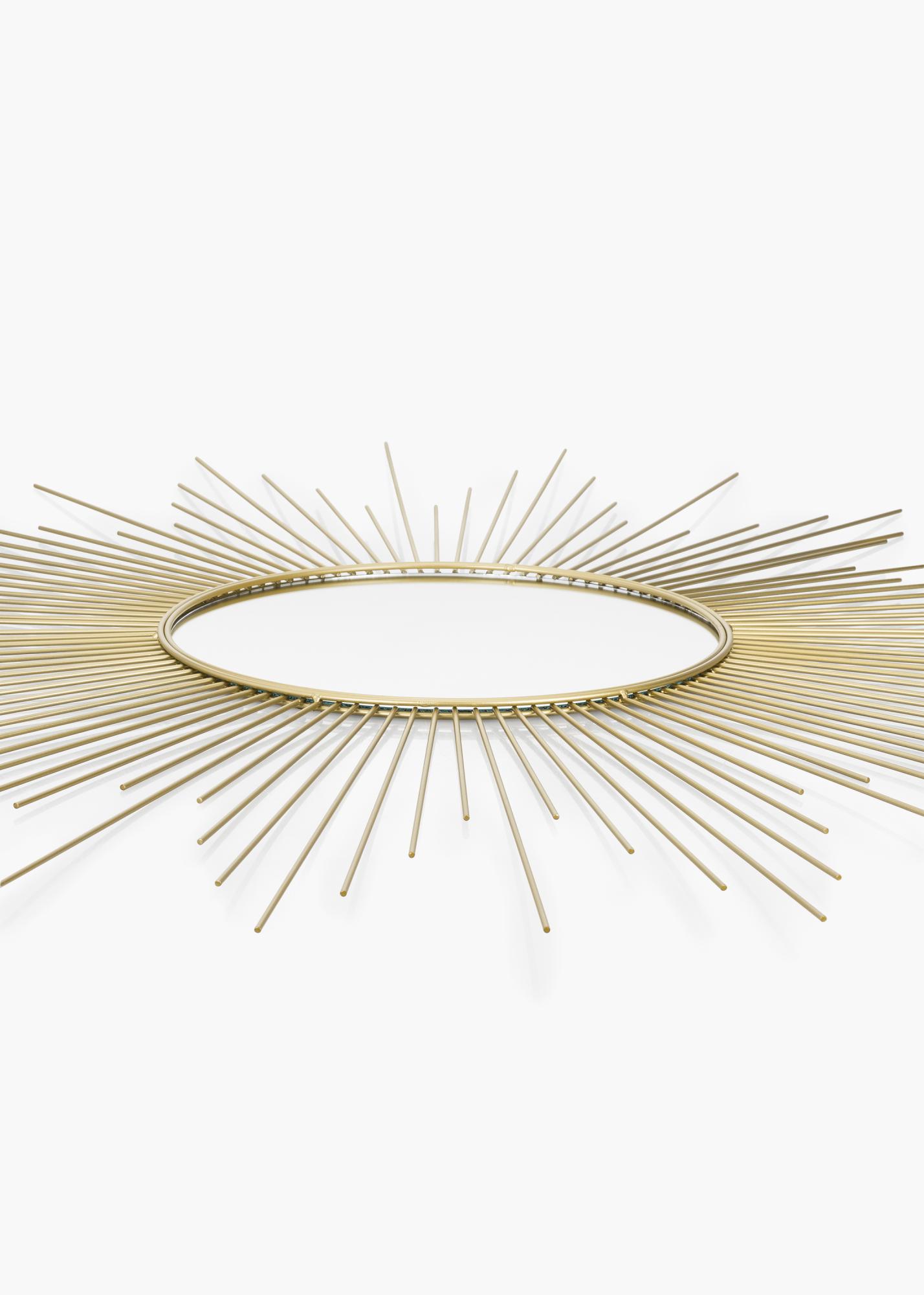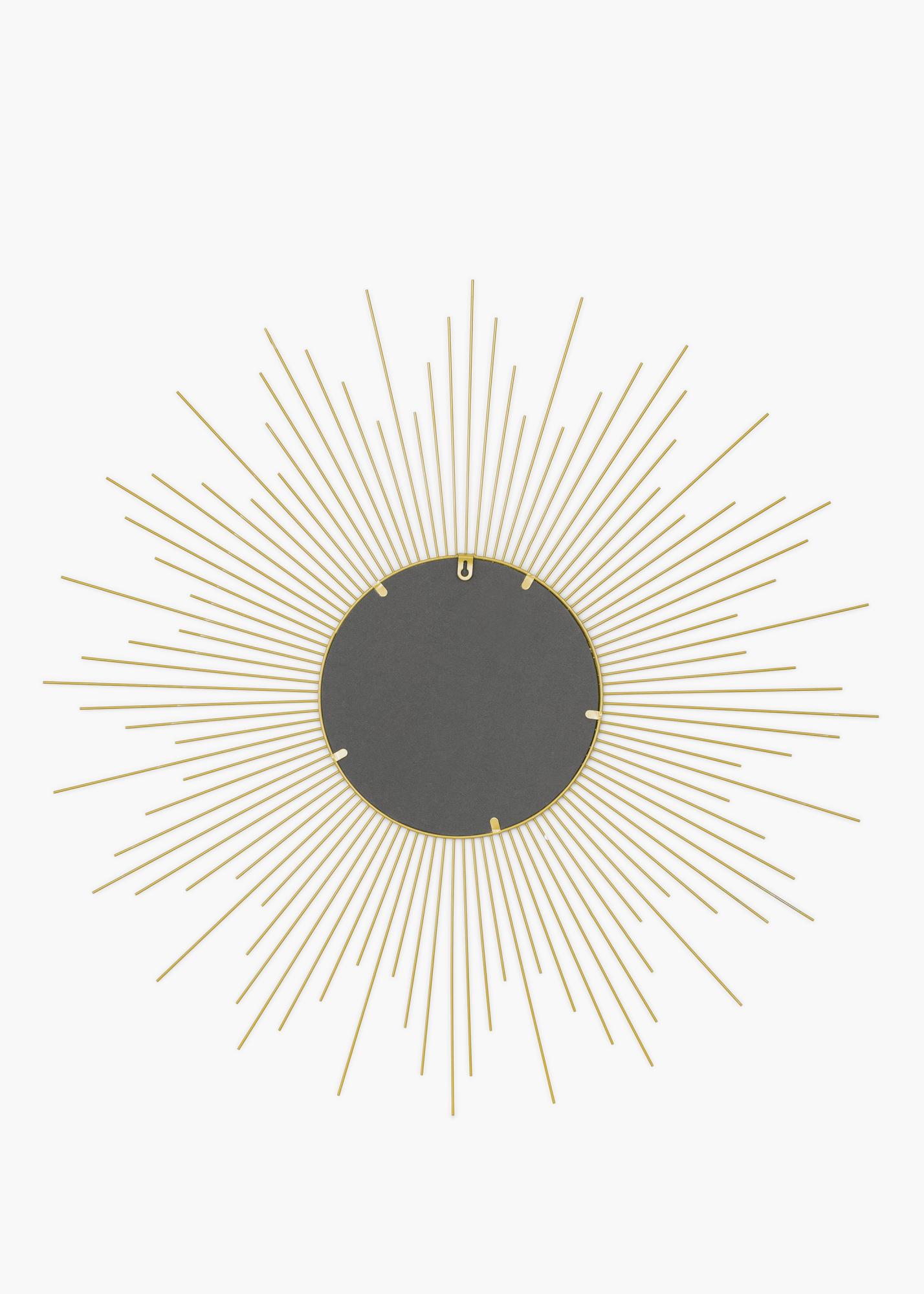 Tai yra apvalus sieninis veidrodis labai dekoratyvaus dizaino. Veidrodžio stiklas yra įrėmintas raštu, kuris primena žvaigždę ir yra švelnios auksinės spalvos. Patalpinkite šį gražų veidrodį namuose gerai parinktoje vietoje, kur jis atsiskleistų kaip dekoratyvus elementas, kad suteiktumėte akį traukiančią interjero detalę. Veidrodis matuoja 90x90 cm išmatavimų ir yra pagamintas iš metalo.