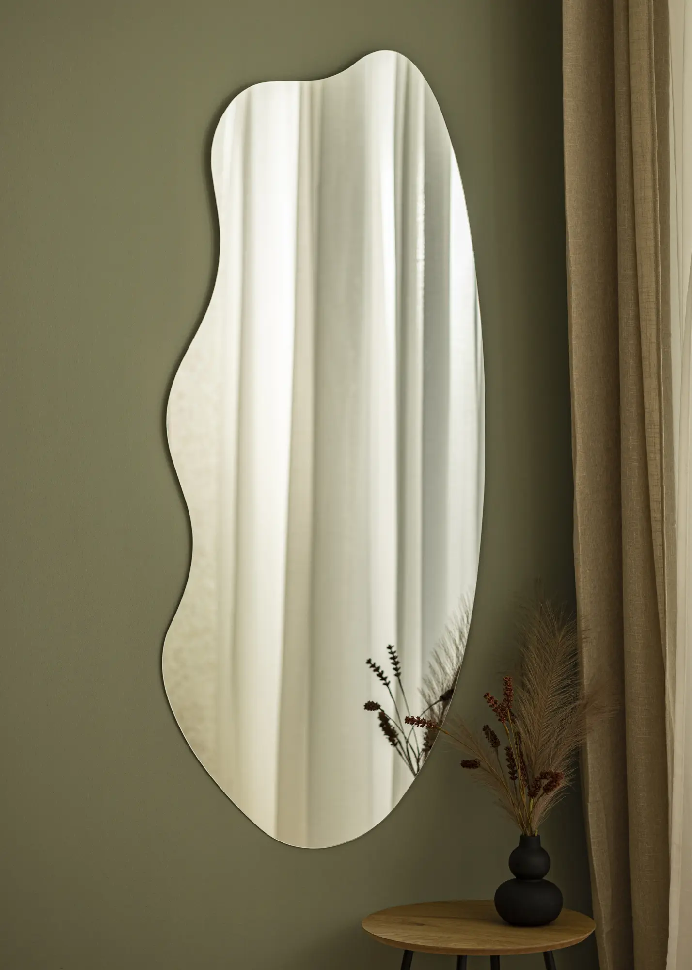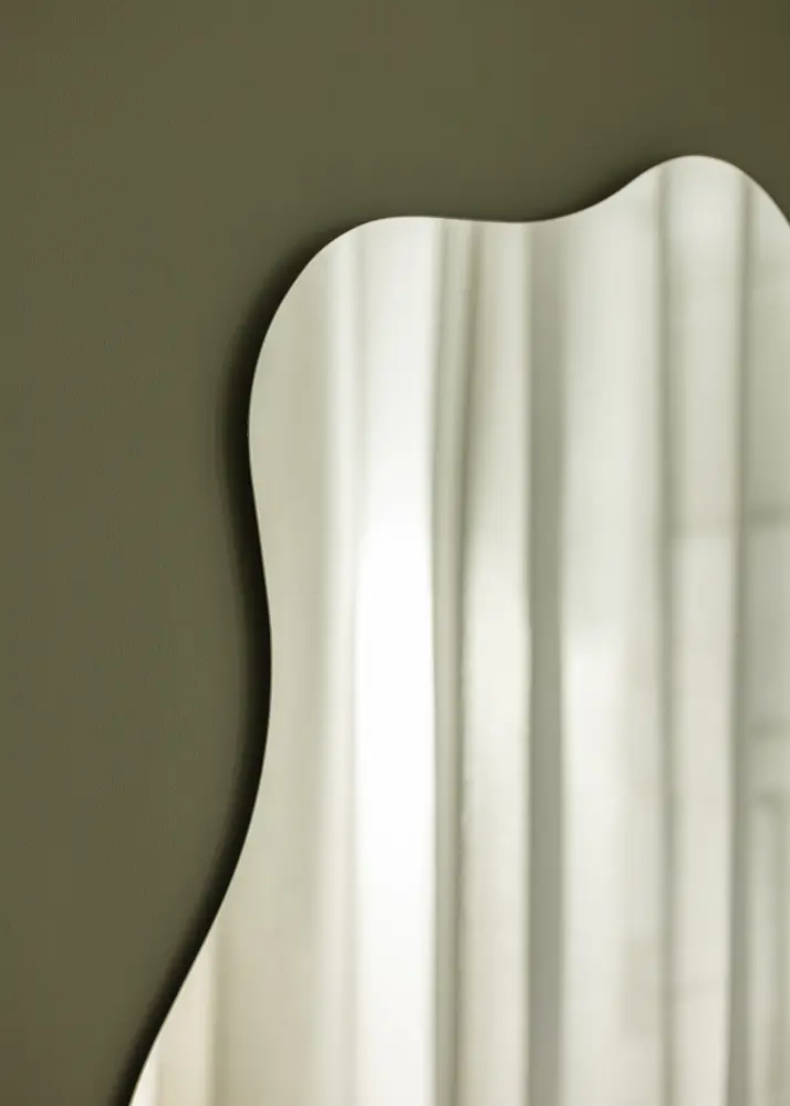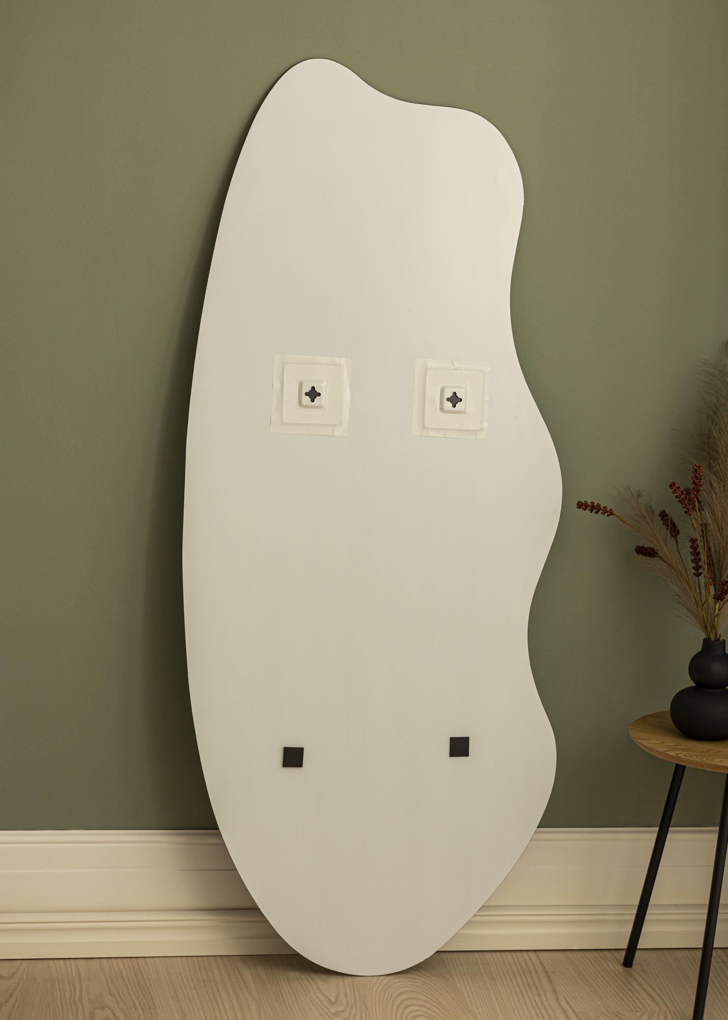 Asimetrinis sieninis veidrodis yra įspūdingas interjero elementas kiekvienuose namuose. Šis veidrodis turi unikalią formą, kur vienas ilgas šonas yra suapvalintas, o kitas turi banguotą formą. Kartu jie sudaro įdomią ir elegantišką visumą. Veidrodis puikiai tinka tiek prieškambaryje, tiek gyvenamajame kambaryje, taip pat veikia ir kaip madingas vonios kambario veidrodis.