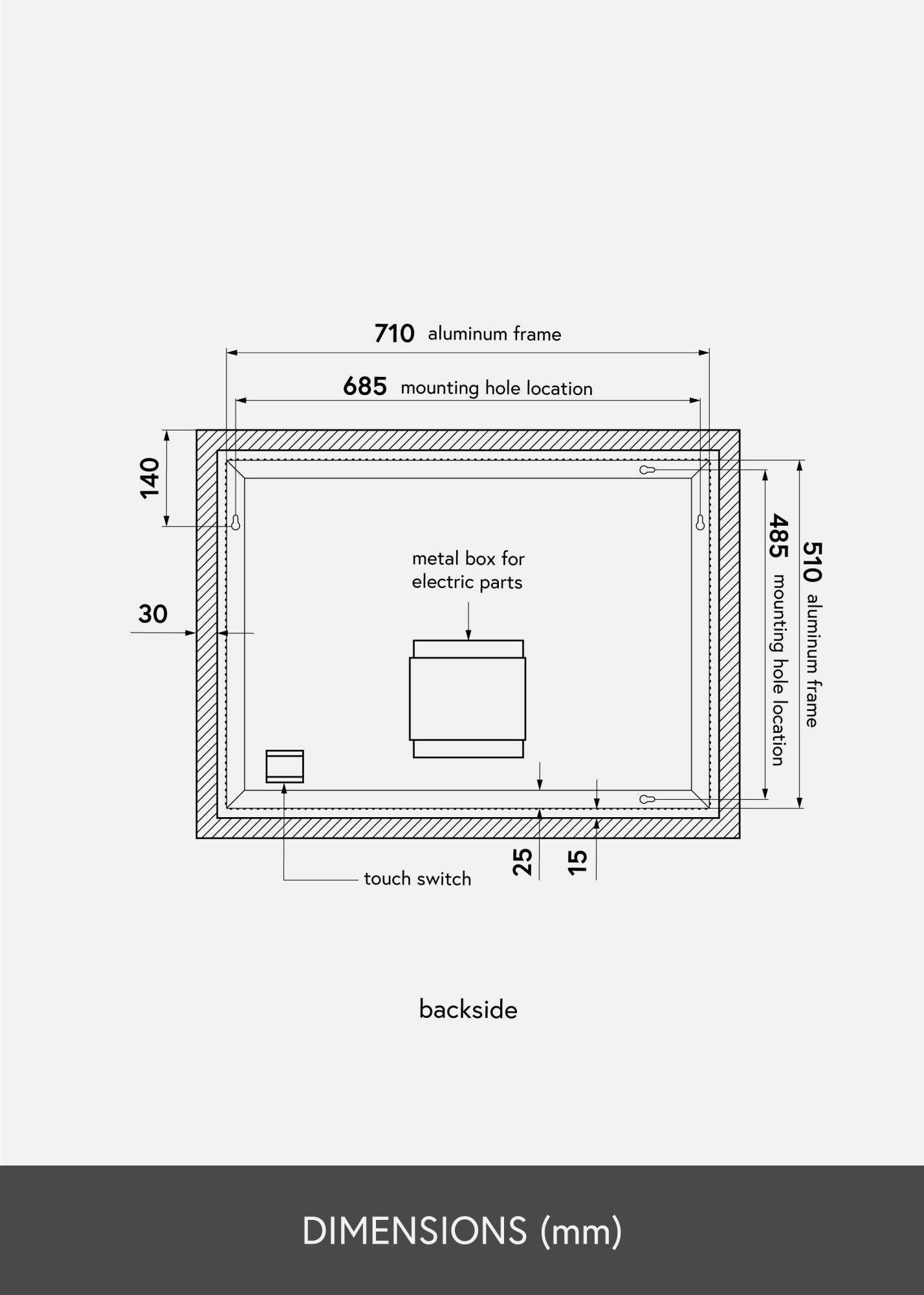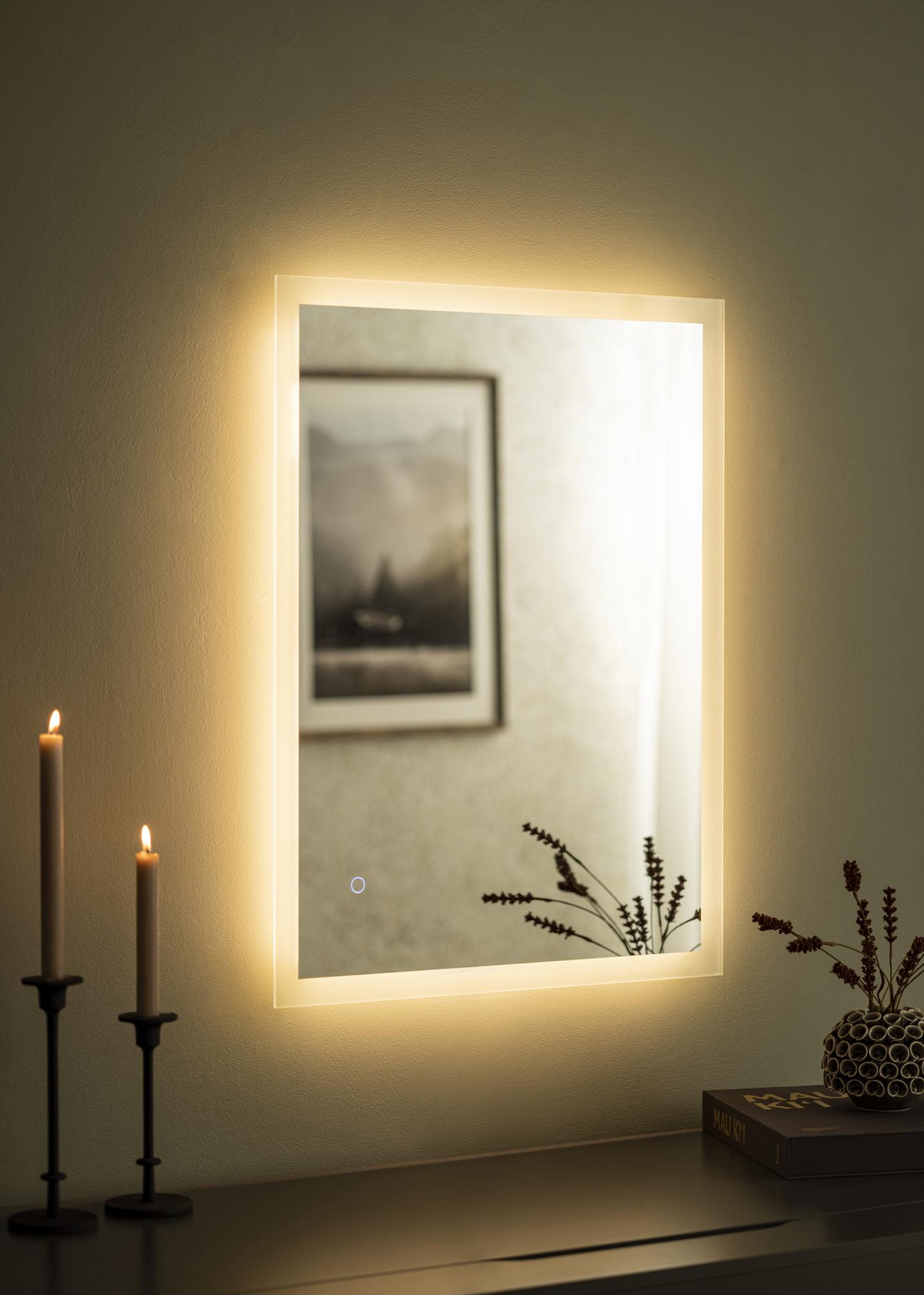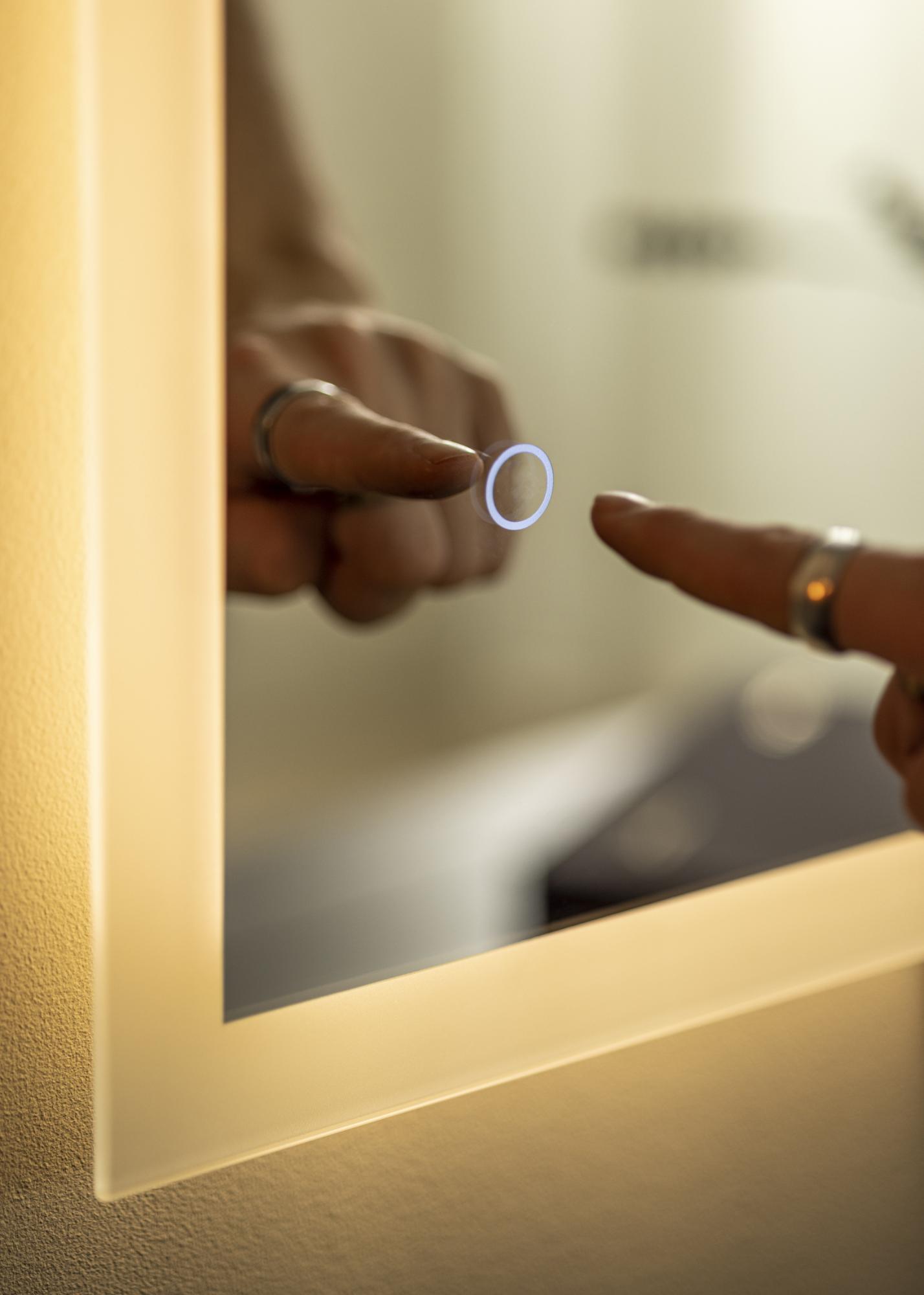 Šis amžinas veidrodis su apšvietimu pakels jūsų vonios kambario stilių. Jis turi integruotą LED juostą ant veidrodžio nugarinės pusės, kuri sukuria švelnų apšvietimą, rėminantį veidrodžio paviršių. Apšvietimas suteikia 3000K šviesos efektą, kurį galite pakoreguoti paliesdami jutiklinį mygtuką viename veidrodžio kampe kelias sekundes. Šviesos intensyvumas gali būti nustatytas nuo 10% iki 100%.