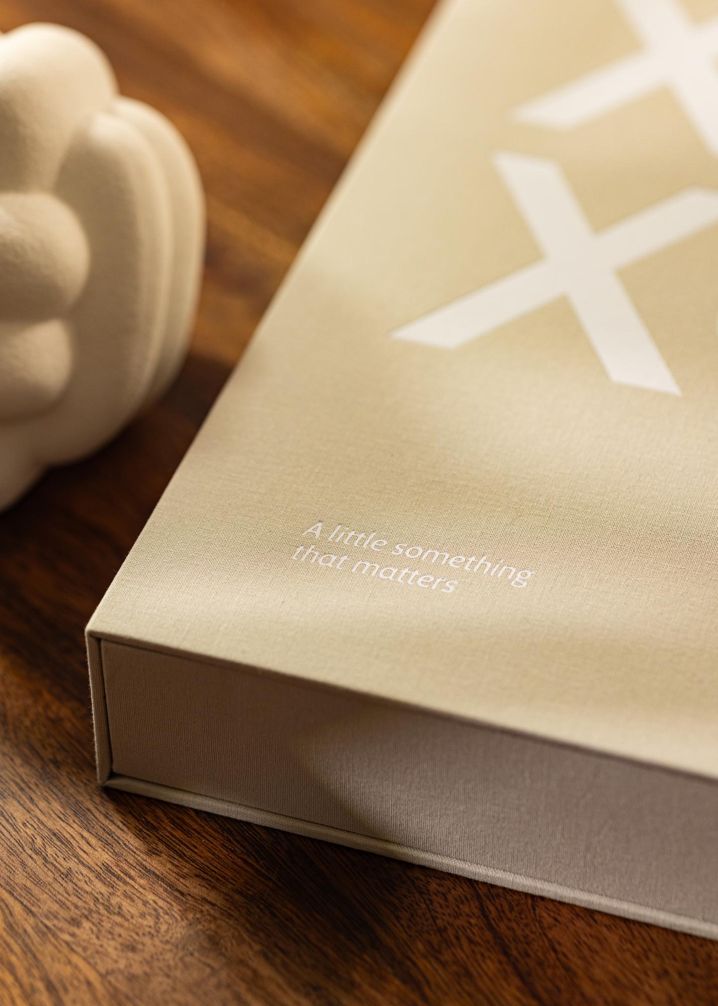 Šis stilingas fotoalbumas sukurtas kaip madinga kavos stalo knyga, todėl taip pat vadinamas kavos stalo fotoalbumas. Viršelis elegantiškai aptrauktas pilku tekstilu, o albumo priekyje ir nugarinėje dalyje yra baltas užrašas su gerai žinomu atsisveikinimo sveikinimu „XOXO“, kuris reiškia bučinius ir apkabinimus. Šis madingas pavadinimas papildytas ir antrašte „A little something that matters“, kuri yra atspausdinta kairiajame albumo kampe. Tai labai stilingas fotoalbumas su išskirtiniu ir žaismingu dizainu, kuris neabejotinai išsiskiria iš kitų.