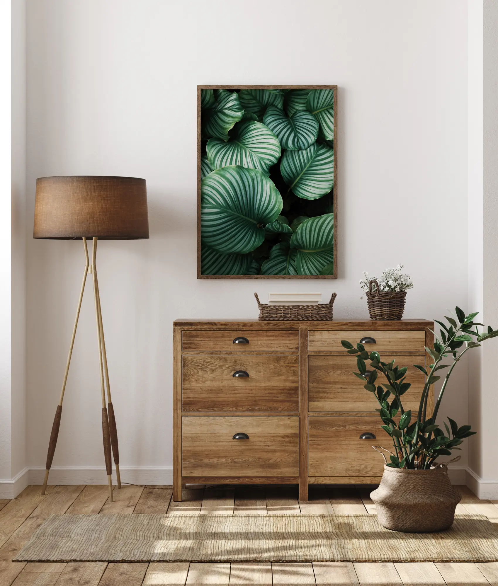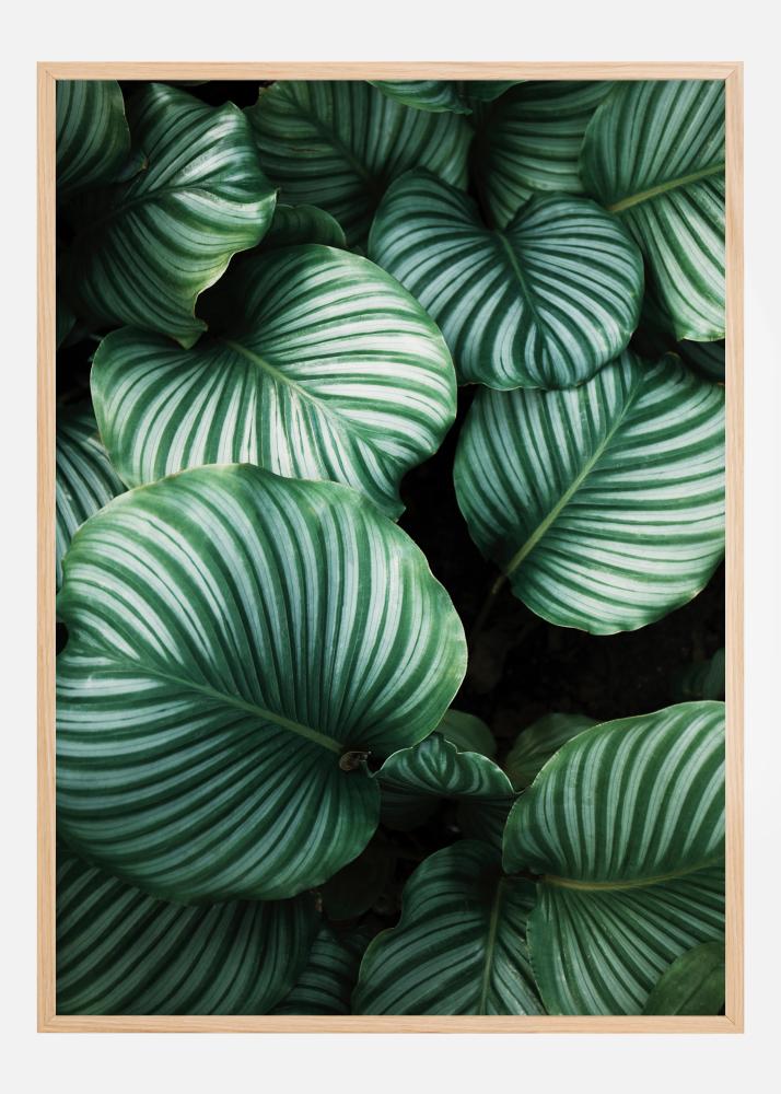 Gražus plakatas paukščio skrydžio vaizdu su tamsiais, žaliais kalatėjos lapais. Saulės šviesa krinta ant lapų ir sukuria skvarbią šviesą. Įvairūs žali atspalviai kuria intensyvią aplinką, todėl tai yra puikus vaizdas, kurį galima pakabinti, apsuptą augalų, svetainėje.
