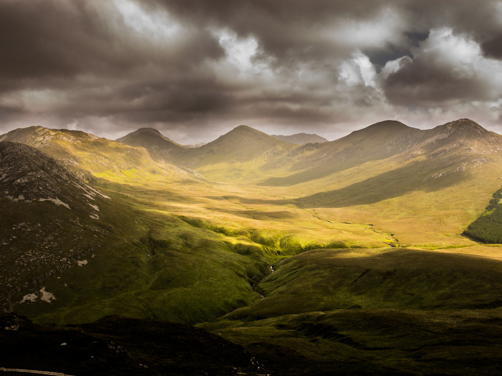 Dramatiškas kraštovaizdžio portretas su audros debesimis, kylančiais virš kalnų grandinės, o saulė apšviečia apačioje esančią slėnį. Tamsios, prislopintos spalvos pabrėžia dramatišką vaizdo pobūdį ir daro fotografiją tikrai išskirtinę. Geriausiai tinka rėme, kuris pabrėžia vaizdo gylį ir neatitraukia dėmesio nuo motyvo.