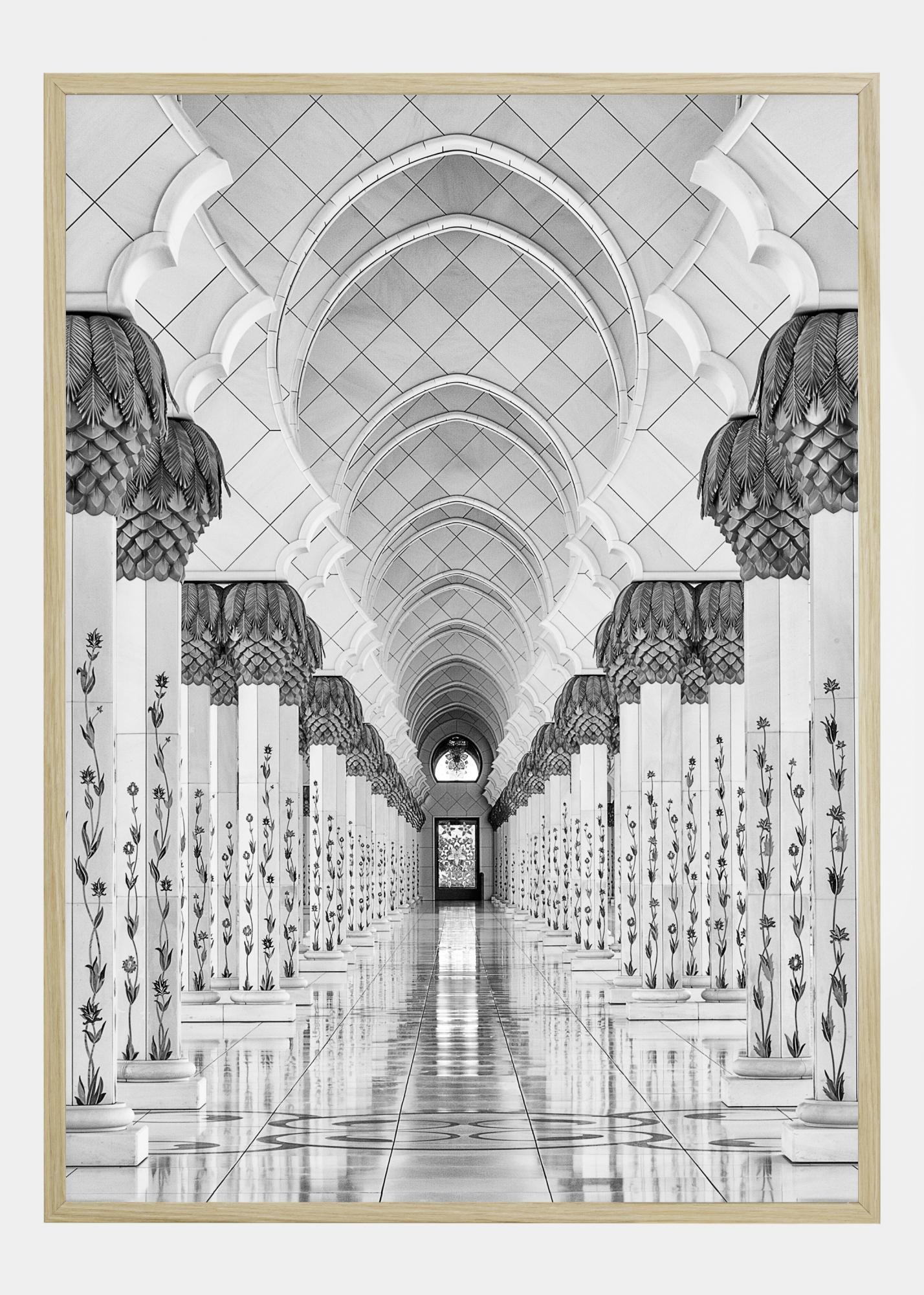 Juodai baltas plakatas, kuris sukuria gylio iliuziją. Dvi stulpelių eilės veda prie tolimų stiklo durų. Stulpeliai gražiai dekoruoti gėlėmis. Natūrali šviesa skverbiasi pro stiklo duris ir sukuria atspindį ant grindų. Pakabinkite šį spaudinį, kad sukurtumėte papildomos erdvės pojūtį.