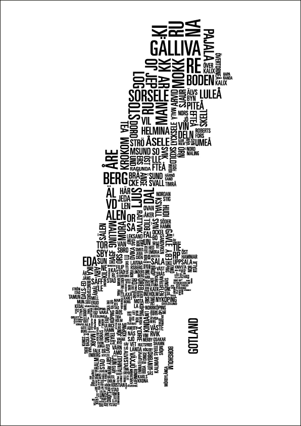 Išmokite visų Švedijos savivaldybių pavadinimus naudodamiesi šiuo kūrybišku Švedijos žemėlapiu! Juodai baltas plakatas vaizduoja Švedijos žemėlapį, sudarytą tik iš teksto. Tekstas piešia, kurioje šalies vietoje atitinkama savivaldybė yra labai gražiai.
