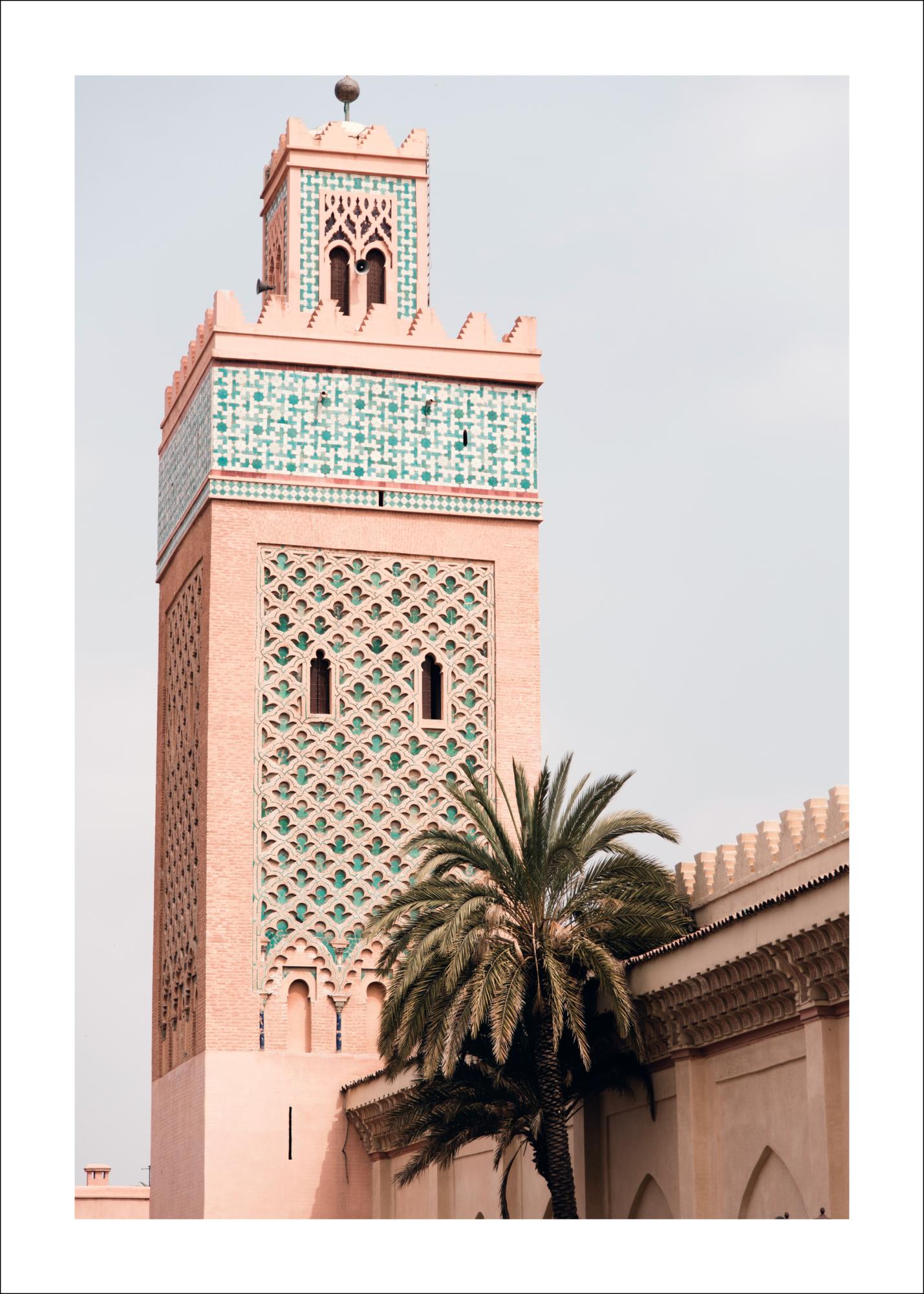 Plakatas su Kutubijos mečete Marakeše dienos šviesoje. Nuostabios persiko ir turkio spalvos puikiai susilieja su šviesiai mėlynu dangumi. Apačioje paveikslo matomas vienišas palmės medis su savo šakomis, kurios uždengia apatinę mečetės stogo dalį. Ši persiko spalvos akmeninė struktūra sukuria ramią atmosferą.