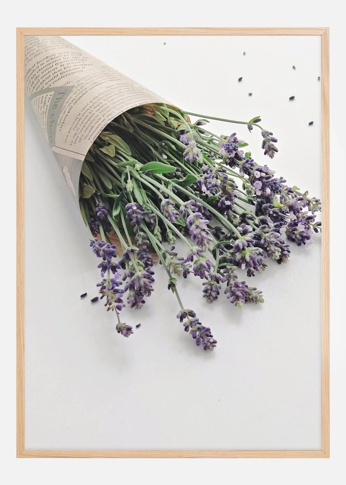 Šis žavingas ir kaimiškas plakatas užfiksuoja prancūziškos provincijos estetikos esmę su levandų puokšte, kurios kvapas beveik jaučiamas per paveikslą. Violetinės gėlės gražiai guli ant baltos fono ir yra elegantiškai suvyniotos į popierių su tekstu, suteikiantį senovinį pojūtį ir primenantį ankstų rytą gėlių turguje. Šis motyvas puikiai tinka bet kuriam kambariui suteikti ramybės ir natūralaus grožio pojūtį, taip pat pridėti romantišką prisilietimą prie interjero.
