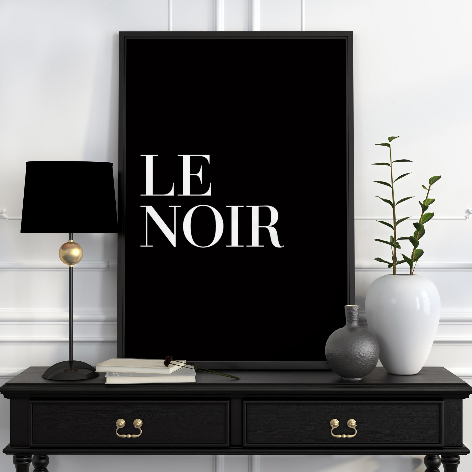 Paprastas ir minimalistinis plakatas su tekstu „Le Noir“, Juoda, didelėmis baltomis raidėmis juodame fone. Plakatas, puikiai tinkantis didelėje paveikslų sienoje, galbūt kartu su plakatu „Le Blanc“, Balta? Papildykite kažkuo iš mūsų plačios rėmų kolekcijos.