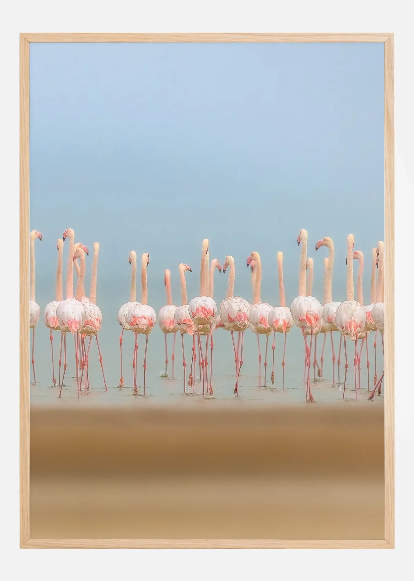 Įspūdingas plakatas su flamingų būriu palei vandens kraštą. Nuostabūs padarai užfiksuoti iš galo, o jų spalva išryškinama dėl neutralių dangaus ir smėlio atspalvių. Puikiai tinka miegamajam dėl fantaziją skatinančio subtilumo.