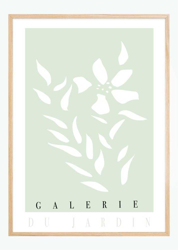 Šis rafinuotas ir minimalistinis Galerie du Jardin plakatas pabrėžia paprastumo grožį. Motyvas sudarytas iš stilizuotos, baltos gėlės raminančiame pilkame fone, sukuriant harmoningą ir atsipalaidavusią atmosferą. Balti lapai išsiskiria pilko tono fone, suteikia švarumo ir modernaus pojūčio, kuris puikiai tinka visiems, kurie vertina subtilų ir elegantišką dizainą.