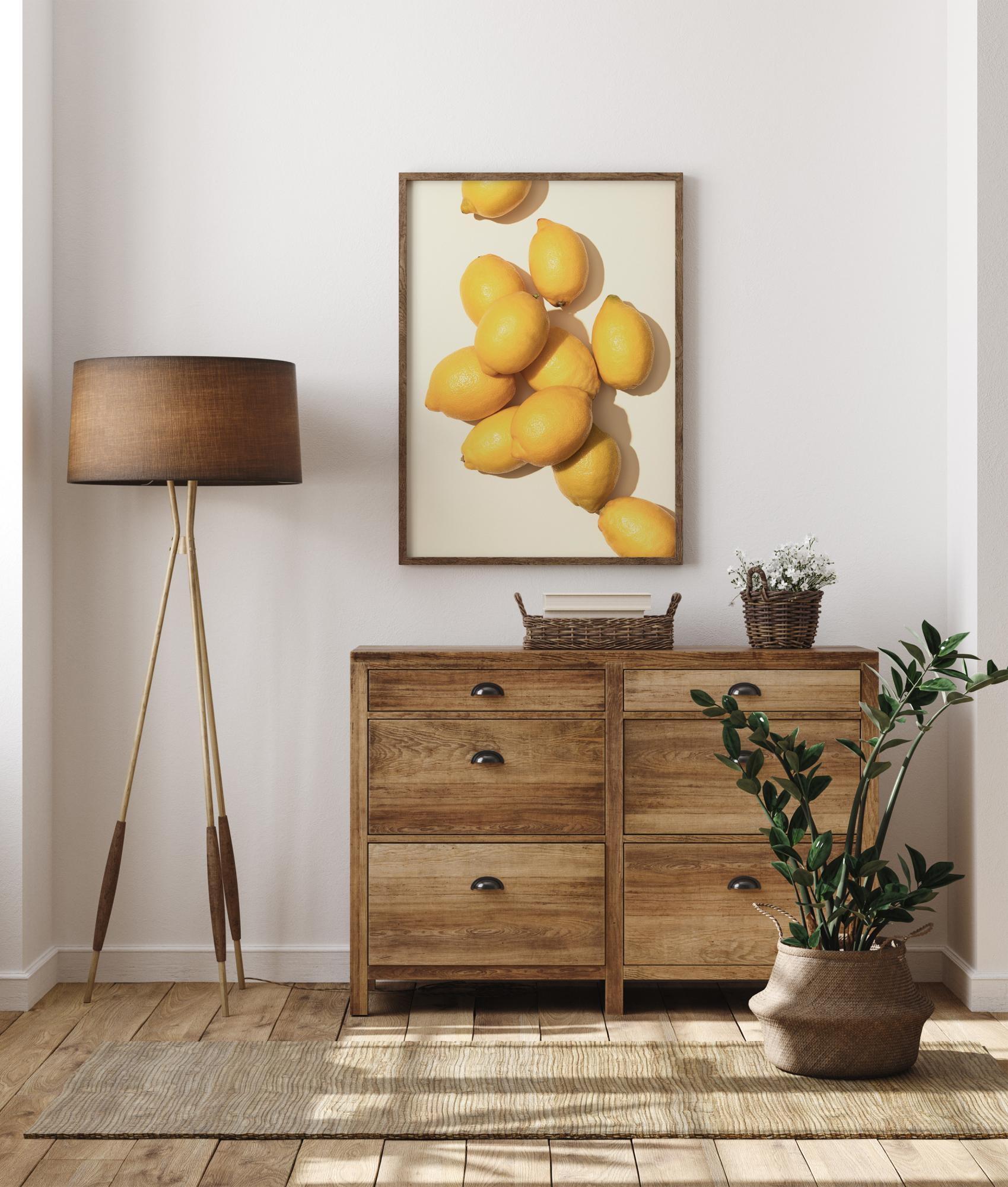 Realistinis citrinų plakatas. Šviesa iš viršaus tiesiogiai projektuojama ant vaisiaus, pabrėžiant žievės šiurkštumą. Šviesa sukuria šešėlius, kurie tęsiasi per baltą foną. Pajuskite šio citrusinio vaisiaus gaivą, kai pakabinsite šį spaudinį savo virtuvėje.