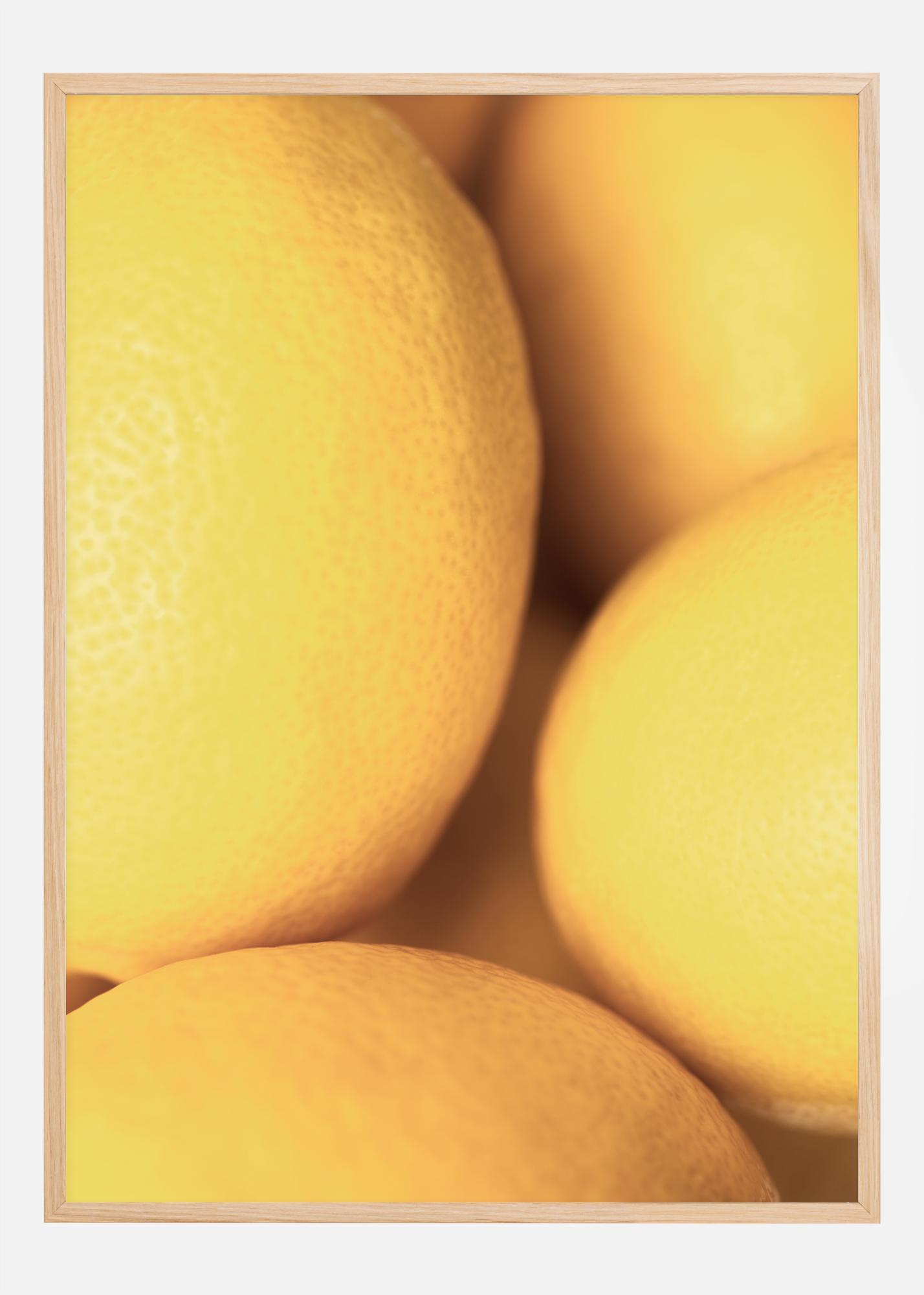 Gražus keturių citrinų stambaus plano atspaudas. Citrinų šiurkštus žievė priekyje išryškinta natūralios šviesos. Natūrali šviesa sukuria tamsesnį geltoną toną nuotraukos centre. Puikus plakatas virtuvei ar žiemos sodui.