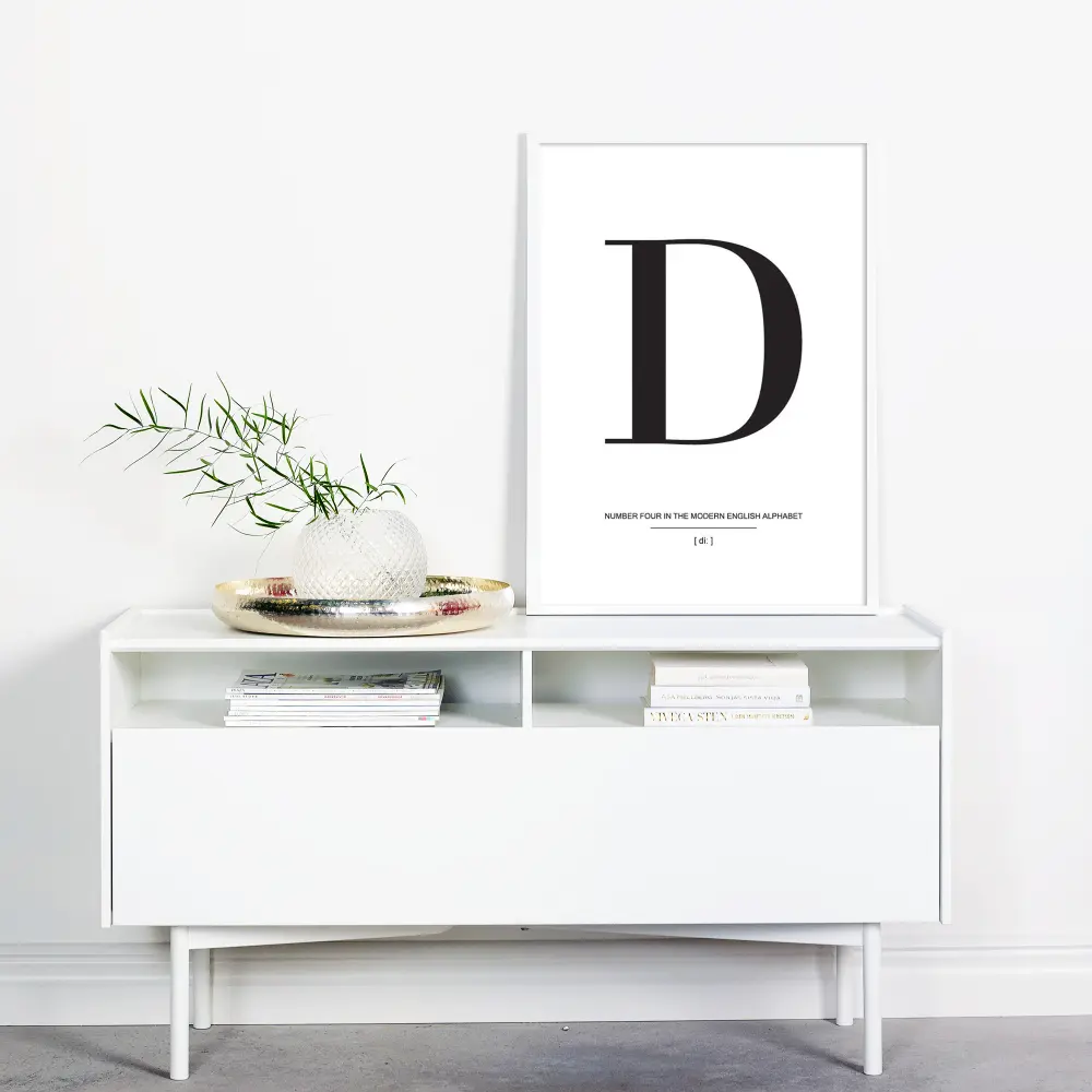 Paprastume yra grožis, ir tai tikrai įrodo šis stilingas plakatas su raide D juodos spalvos ant baltos fono. Plakatas turi elegantišką tipografiją ir turėtų būti papildytas kitais raidžių plakatais iš tos pačios serijos, kad sukurtų madingą ir gražią paveikslų sieną. Pasirinkite mėgstamus raidžių plakatus ir rinkitės iš mūsų didelio kokybiškų rėmų asortimento, tada tegul namuose ant sienų liejasi vaizduotė.
