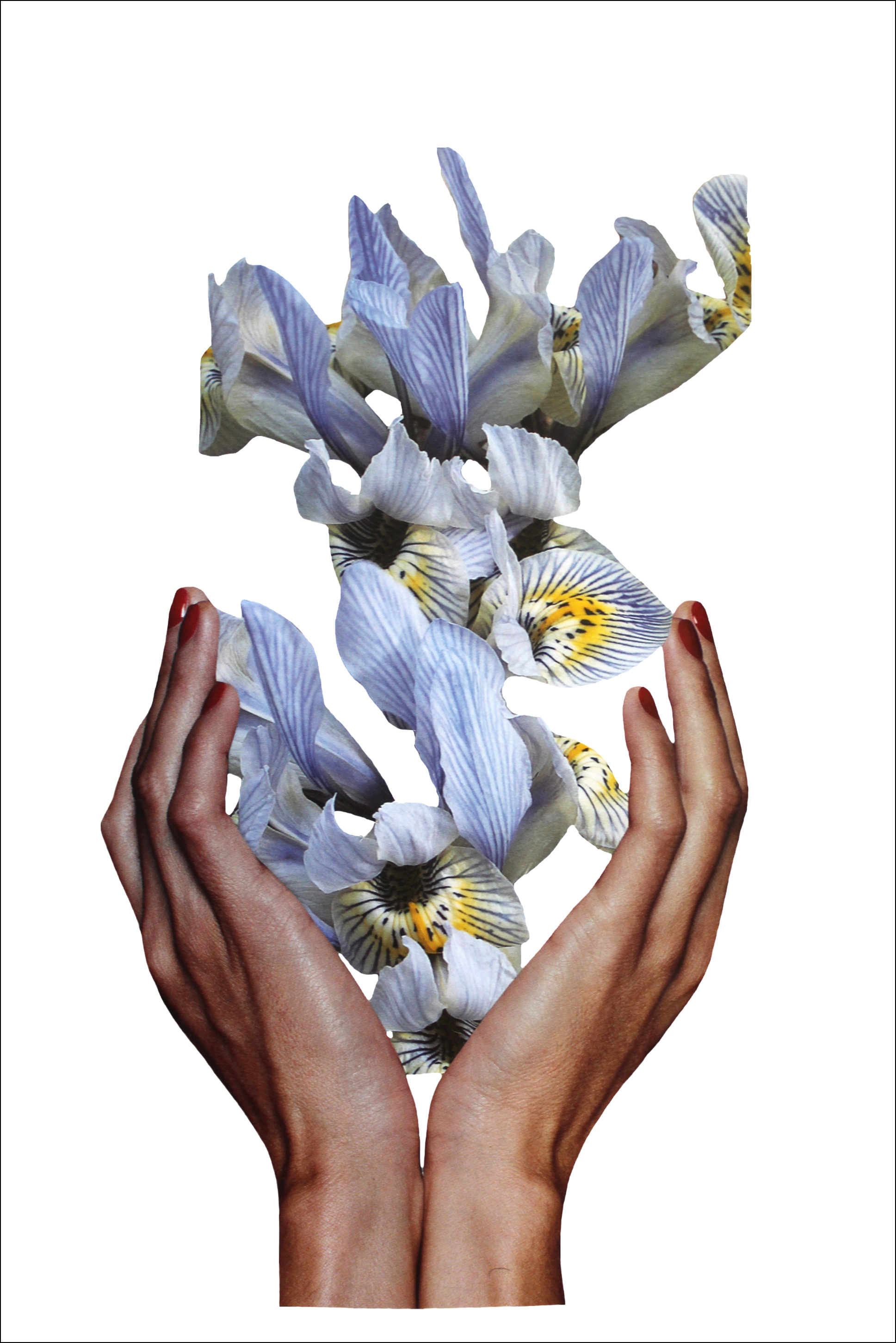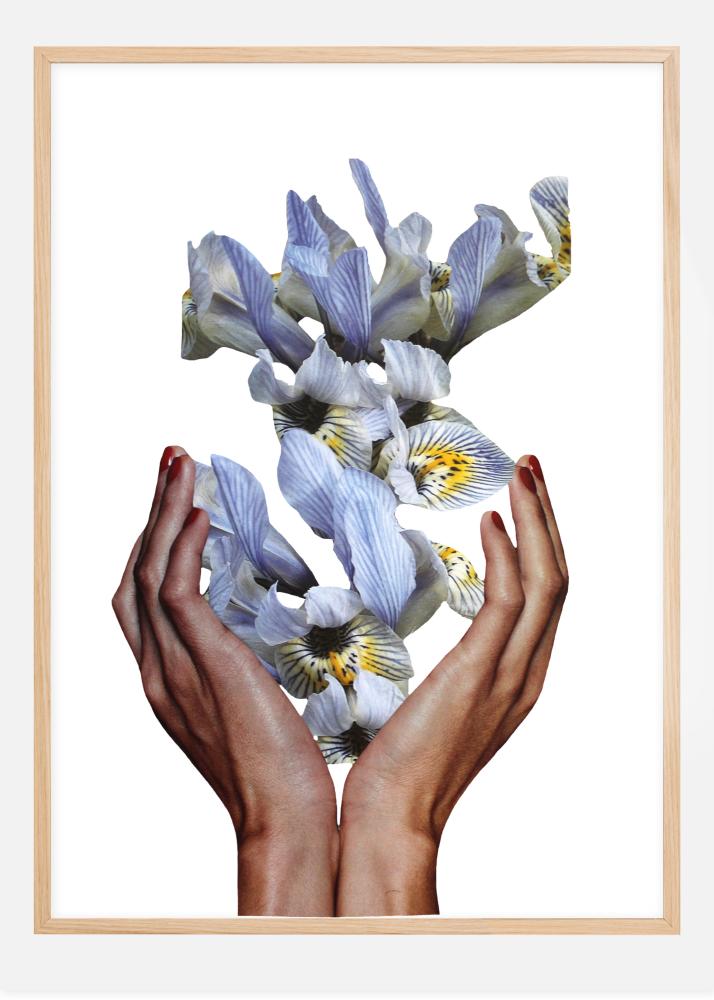 Gražus šviesiai violetinių vilkdalgių vaizdas. Švelniai atmerktos rankos su gražiai nulakuotais nagais atsargiai laiko vilkdalgius. Balta fono spalva sustiprina švelnias violetines ir geltonas spalvas, sukurdama subtilų, tačiau gražų gėlių vaizdą. Atpalaiduojantis plakatas, kuris suteikia gyvybės paprastai baltai sienai.