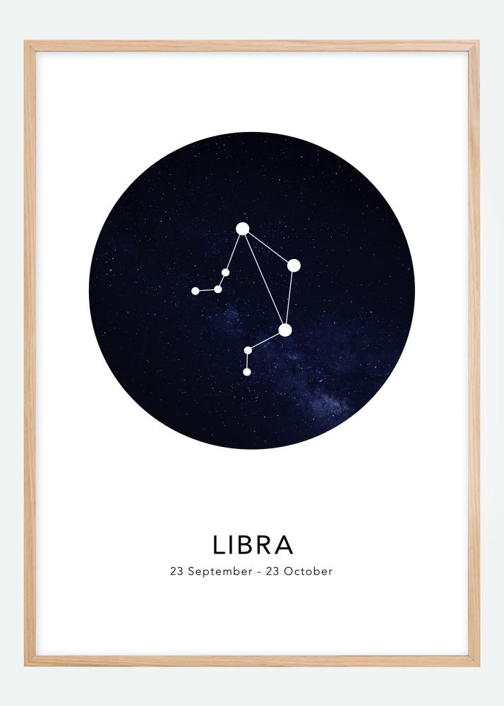 Padovanokite asmeninį paveikslą žmogui, kurį mylite! Ši stilinga plakatas turi Svarstyklių žvaigždyno motyvą su fonu juodos ir mėlynos žvaigždinės dangaus forma. Po apačia yra pavadinimas su galiojančia data anglų kalba.