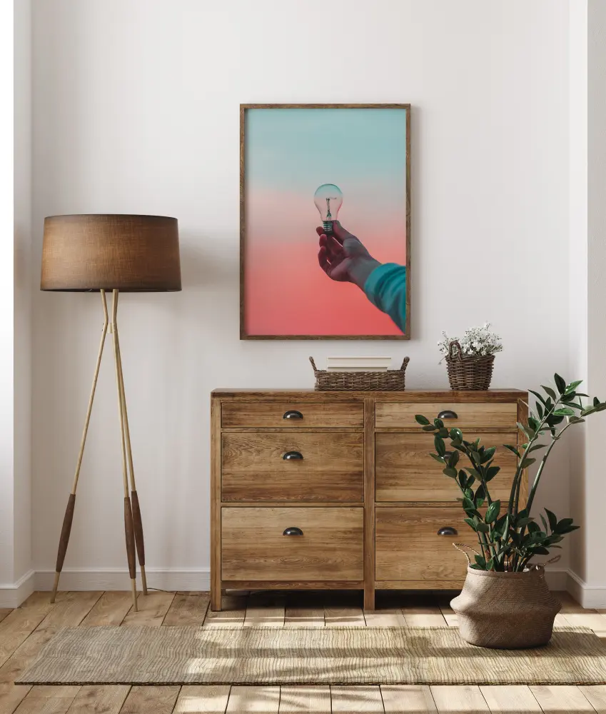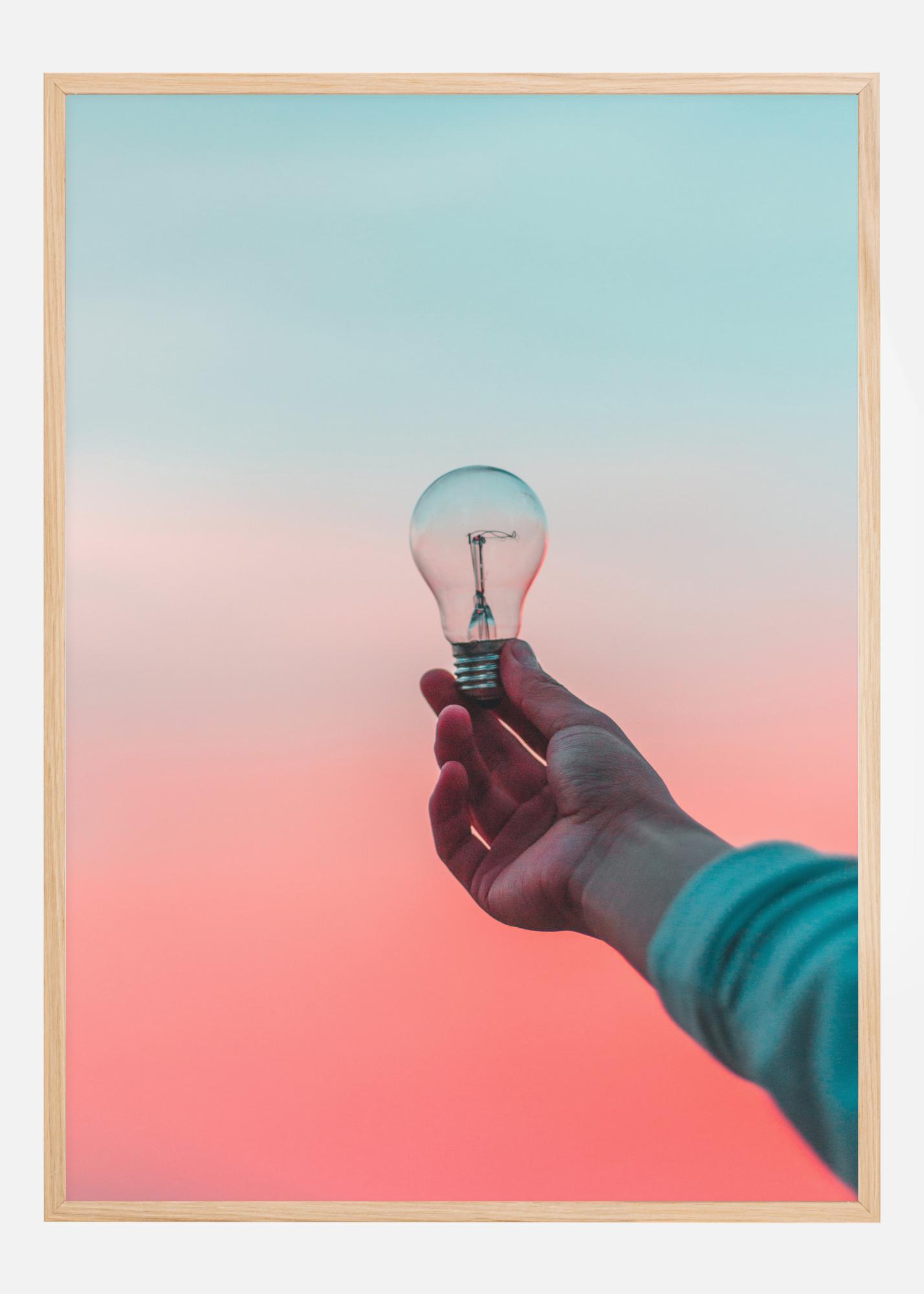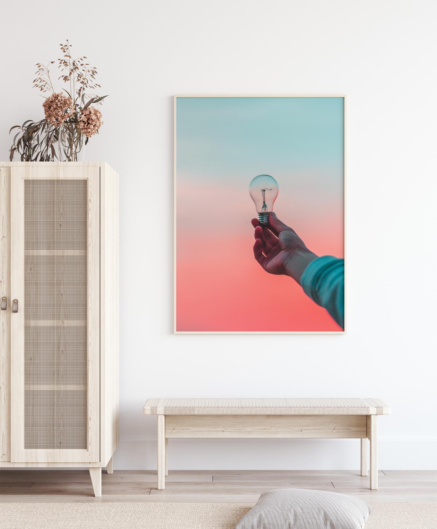 Paprastas lemputės, kuri laikoma dangui, atspaudas. Gražus šviesiai mėlynas dangus išryškina turkio spalvos megztinį ant lemputę laikančio žmogaus. Apatinė plakato dalis atspindi gražią rožinę toną, kuri atsispindi lemputėje. Ramus atspaudas, kuris atrodytų gražiai prieš pastelinių spalvų sieną.