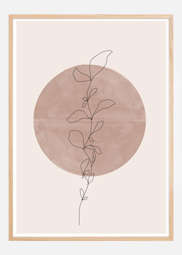 Šiame plakate vaizduojama subtili linijų iliustracija su žydinčia šakele, kurios kontūrai žaidžia su didele, nutapyta apskritimo forma raminančiu, žemės atspalviu. Kontrastas tarp minimalistinio gėlių motyvo ir stiprios foninės spalvos sukuria įdomią dinamiką, kuri yra raminanti ir estetiškai patraukli.