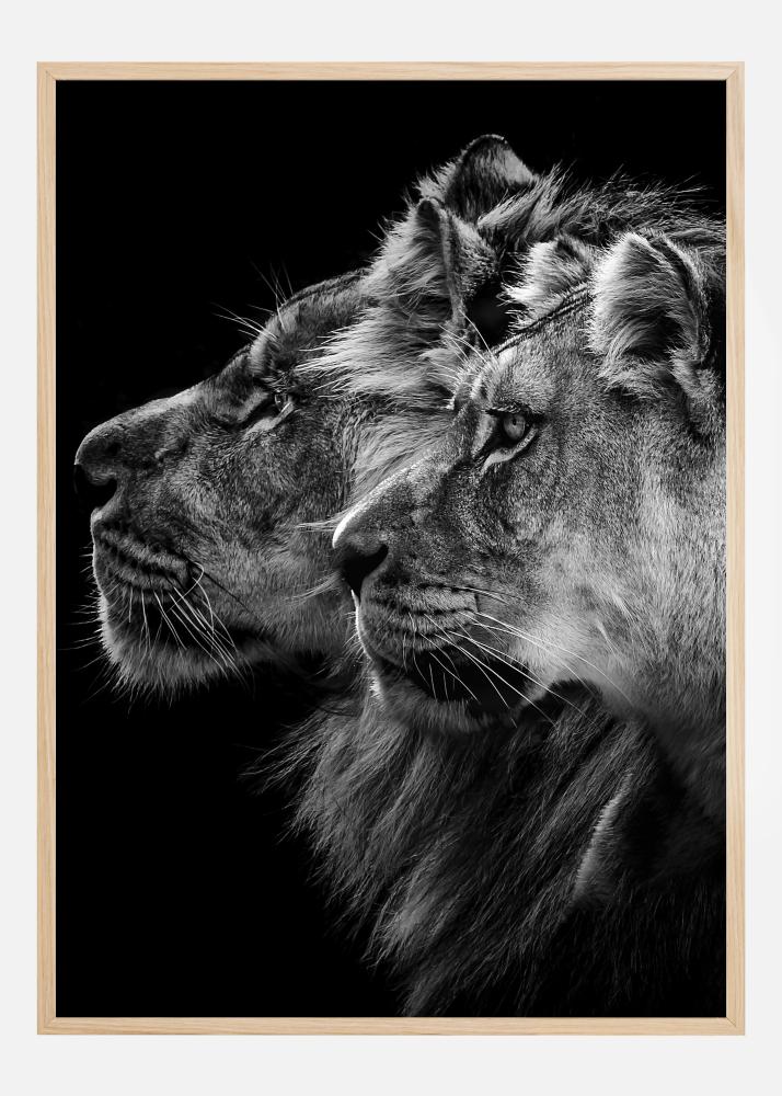Pritraukiantis nespalvotas liūto ir liūtės atvaizdas. Prie juodo fono šios didingos būtybės išreiškia susitelkimą. Natūrali šviesa apšviečia gyvūnų žandikaulių linijas, tad jie atrodo dar labiau dominuojantys. Puikus plakatas visiems gyvūnų mylėtojams.