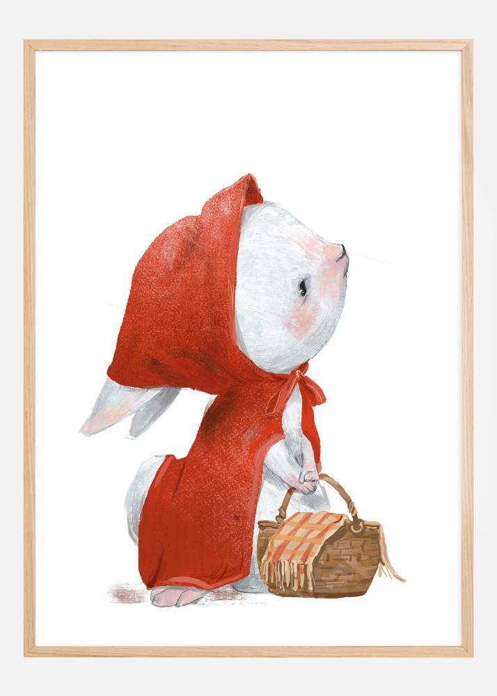Šis žavus plakatas vaizduoja naują klasikinės pasakos apie Raudonkepuraitę interpretaciją, kurioje pagrindinį vaidmenį atlieka mielas mažas triušiukas. Triušis yra apsirengęs ryškiai raudonu kapišonu ir neša krepšelį, suteikdamas mandagią užuominą į garsųjį pasakojimą. Akvarelės technika suteikia vaizdui švelnų ir sapnuojantį elementą, o švelnūs teptuko potėpiai pabrėžia triušio nekaltumą ir žaismingą iliustracijos pobūdį.