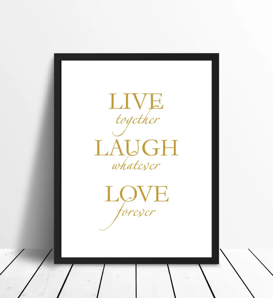 Sumani spausdinti, kuri ragina gyventi gyvenimą ir skleisti džiaugsmą. Ant balto fono spindi auksinės spalvos šriftas, kuris suteikia blizgesio reikšmei, kuri savo teigiama žinute nusipelno garbės vietos namuose. Padėkite plakatą dažnai naudojamame kambaryje, kur jis gali būti priminimas apie daugiau laimės gyvenime, geriausiai kartu su kitais auksiniais aksesuarais.