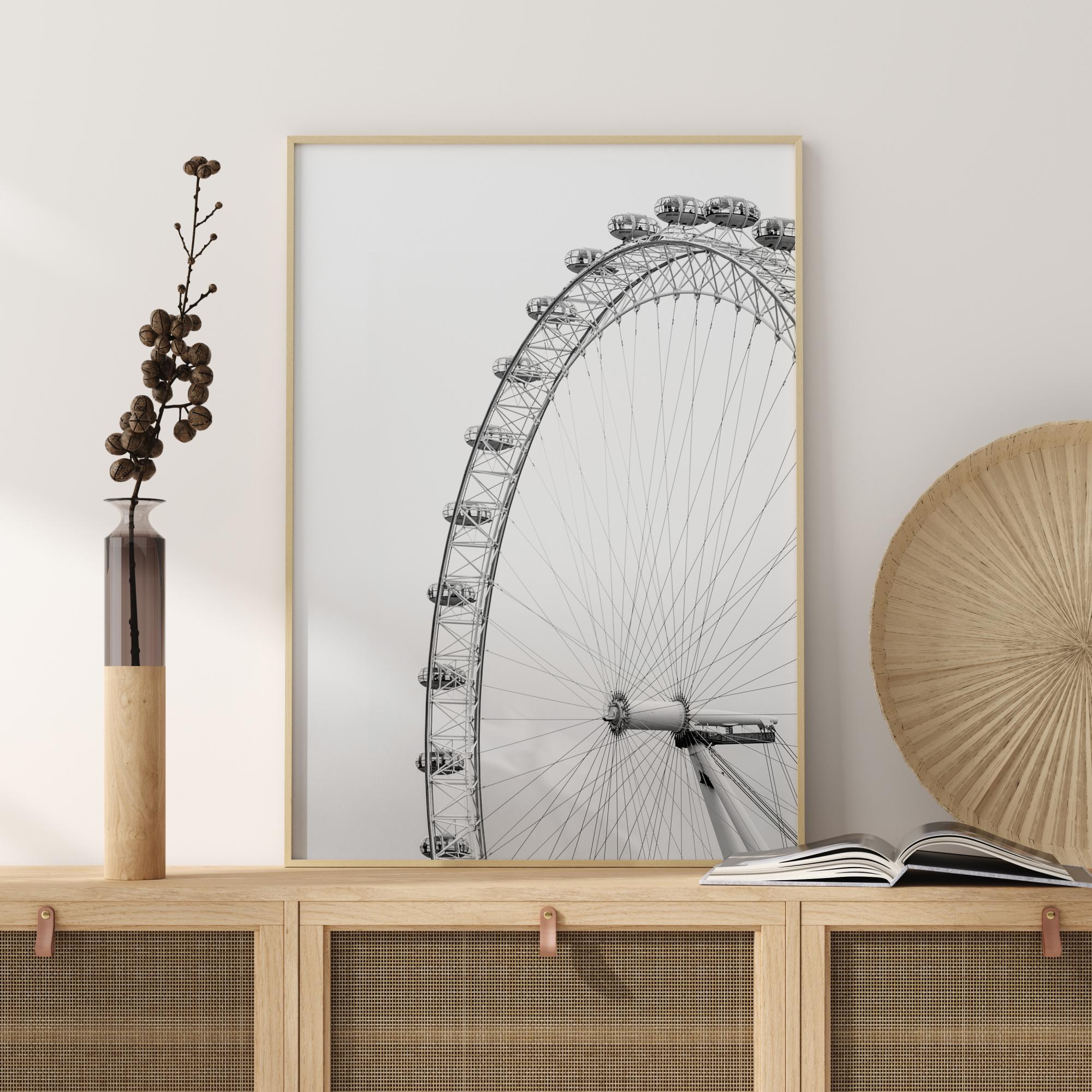 Įspūdingas plakatas su Londono akimi. Su pilka horizontu juodas Londono akies kontūras nukreipia žvilgsnį į keleivių kabinas, esančias ant rato. Įspūdingas spaudinys, pabrėžiantis rato dydį. Gražus spaudinys, sukuriantis begalybės pojūtį.