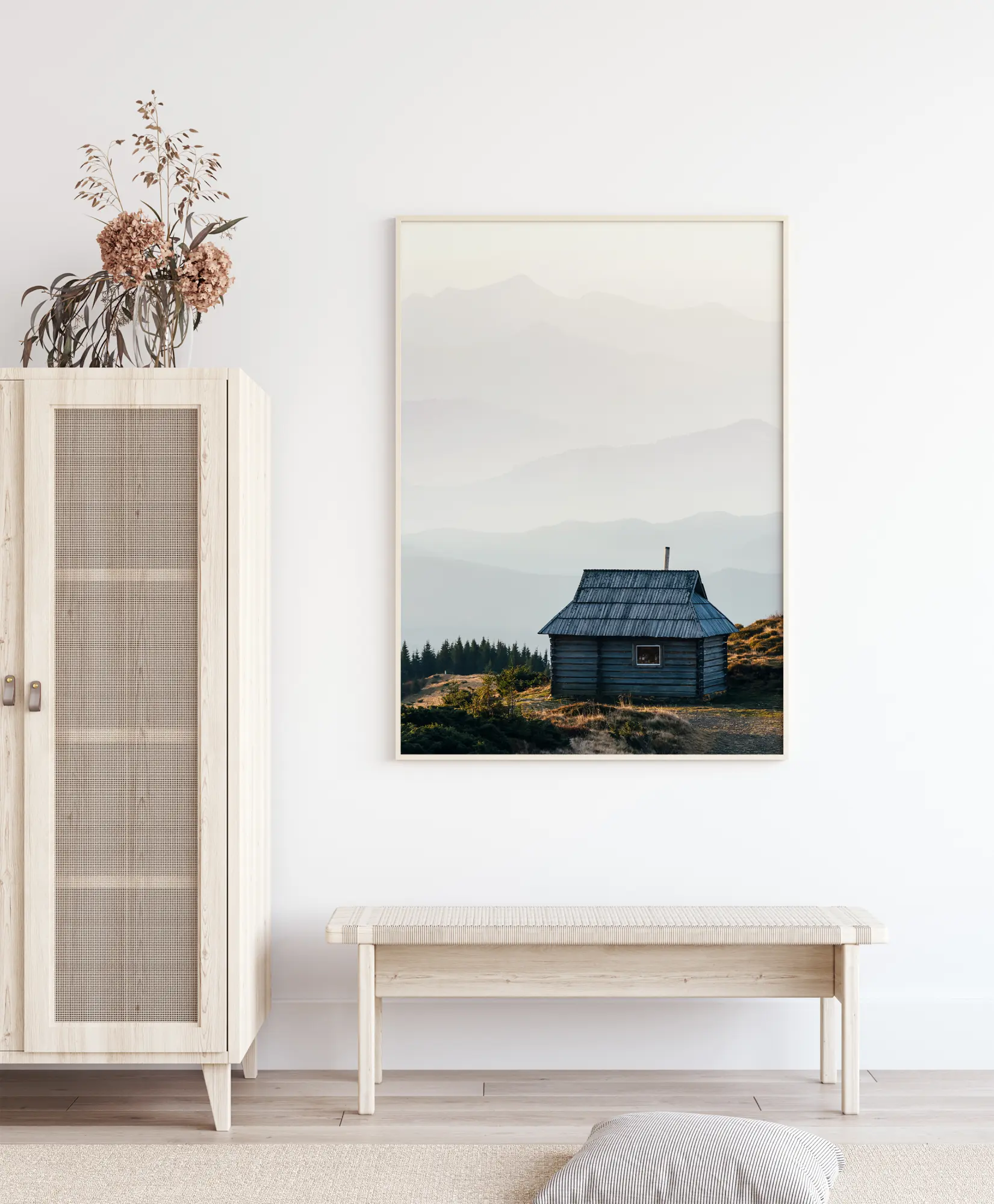 Paprasta, maža mėlyna trobelė ant kalno viršūnės. Tolimos miglotos kalvos sukuria magišką vaizdą. Kairėje trobelės pusėje tamsiai žalios pušys suteikia papildomos spalvos šiam paprastam, bet gražiam plakatui. Pakabinkite jį ant šviesios sienos, kad suteiktumėte erdvės pojūtį.
