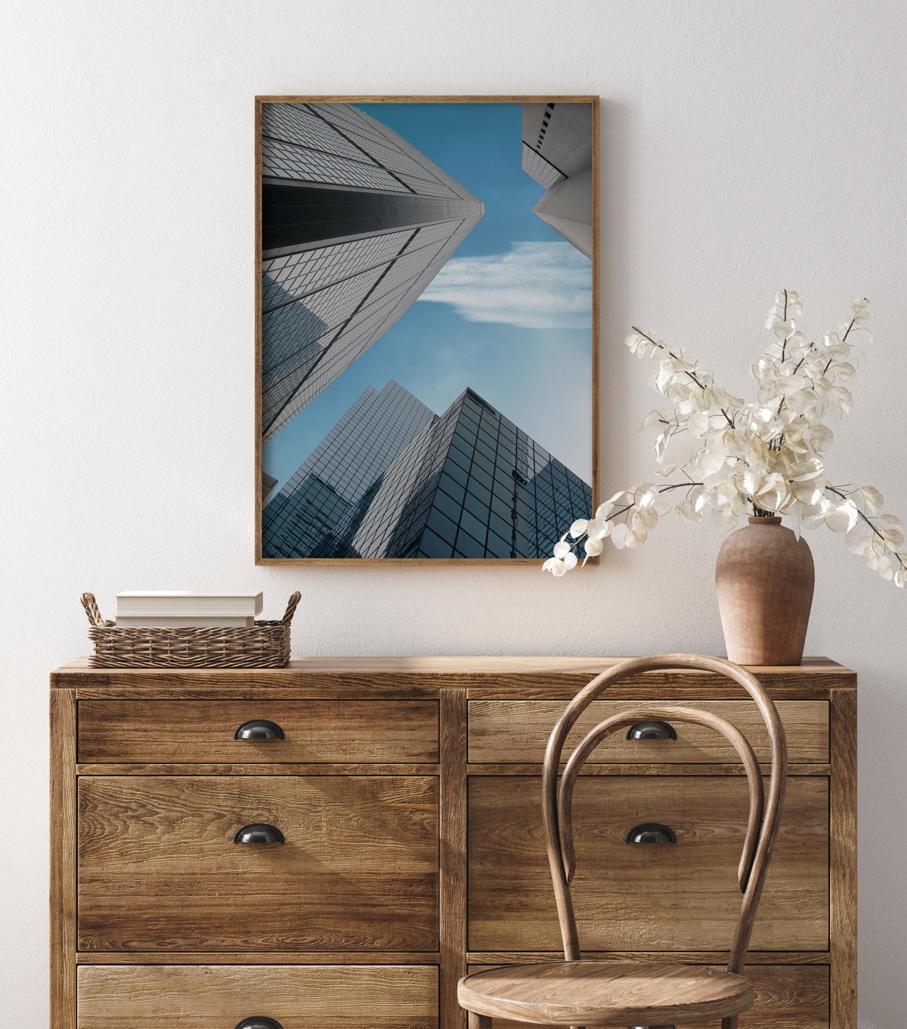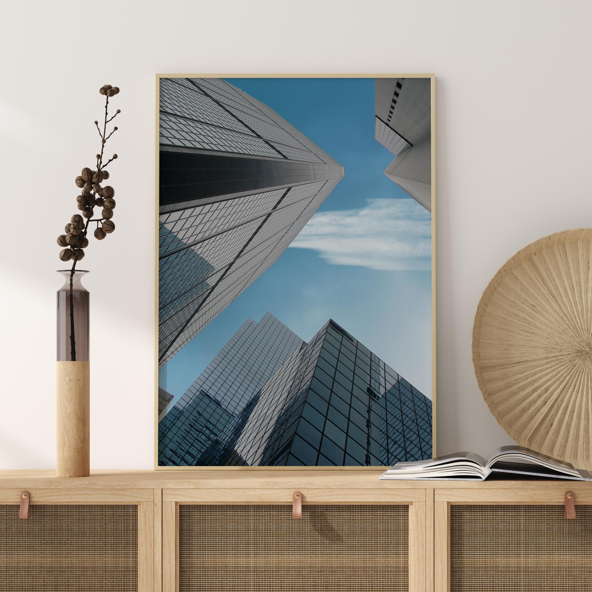 Kvapą gniaužiantis architektūrinis spaudas su pastatais ir veidrodiniais langais. Fotografuota iš varlės perspektyvos suteikia šiam plakatui didingumo pojūtį. Gražus, šviesiai mėlynas dangus su vienu baltu debesiu suteikia šiam gražiam vaizdui papildomą spalvos atspalvį. Puikiai tinka mažesnėje erdvėje, kad mažame kambaryje suteiktų begalybės pojūtį.