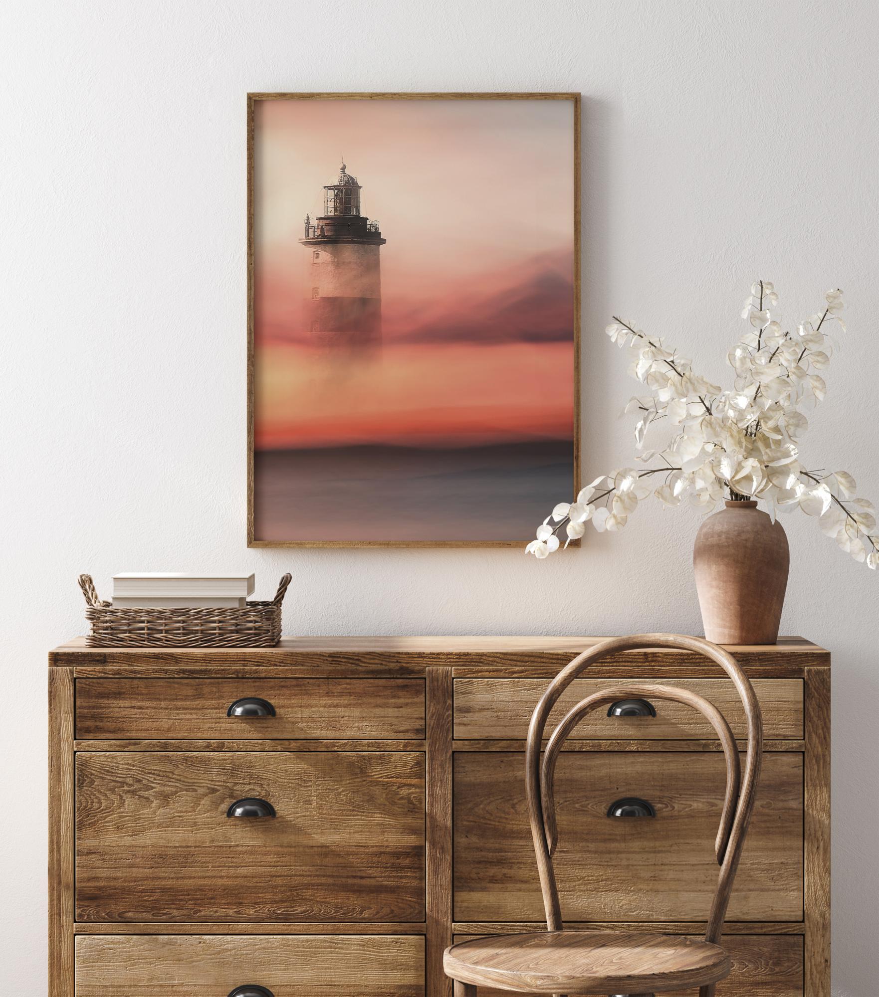 Gražus romantiškas švyturio migloje atspaudas. Švelnios rožinės pastelės spalvos sukuria romantikos pojūtį, o švelniai mėlyna jūra suteikia tamsesnį toną šiam gražiam plakatui. Pajuskite ir girdėkite jūros vėją, kai pakabinsite šį paveikslą savo namuose.