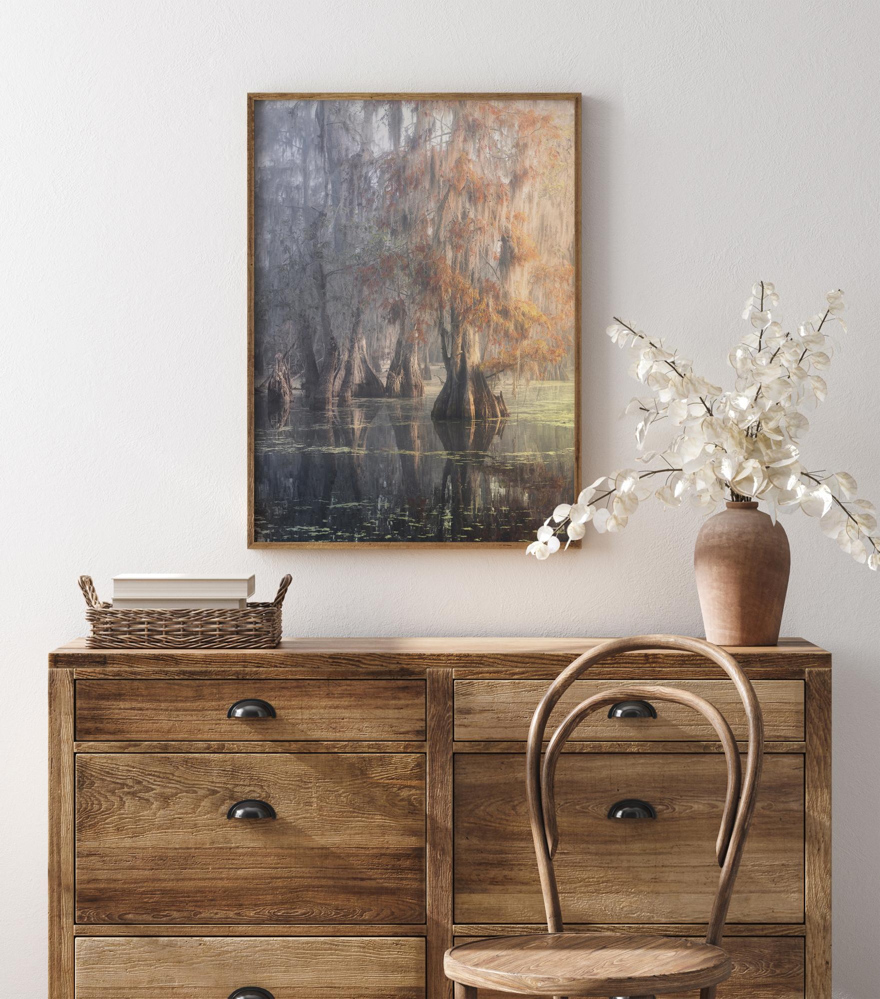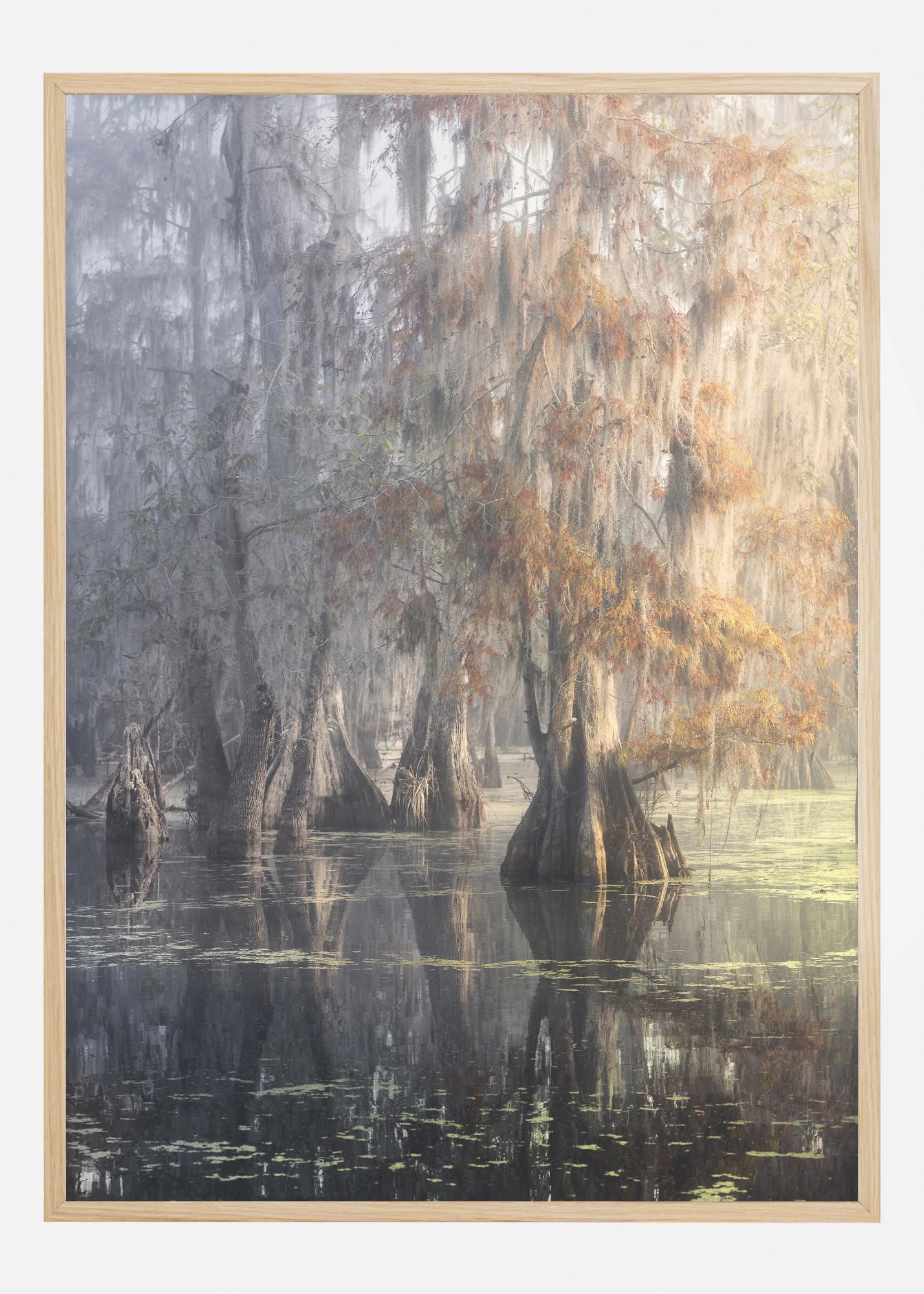 Stulbinančiai gražus plakatas su pelke Luizianoje. Išskirtinai taikus pelkės vaizdas su ramiu vandeniu. Natūrali šviesa sukuria tobulus atspindžius pelkėje ir sukuria ramybės jausmą. Atsineškite gamtą į savo namus su šio spaudinio gražiomis žaliomis ir rudomis spalvomis.