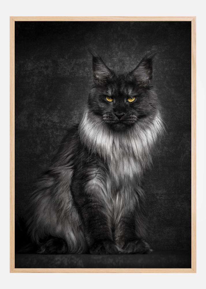 Užburiantis plakatas su juodai balta kate panašios spalvos fone. Katės mažos geltonos akys su išdidžiu, bet agresyviu žvilgsniu sukuria dominavimo jausmą. Ji žiūri tiesiai į kamerą, o katės baltas kaklo žiedas švelniai susilieja su spauda. Puikus spaudinys gyvūnų mylėtojams.