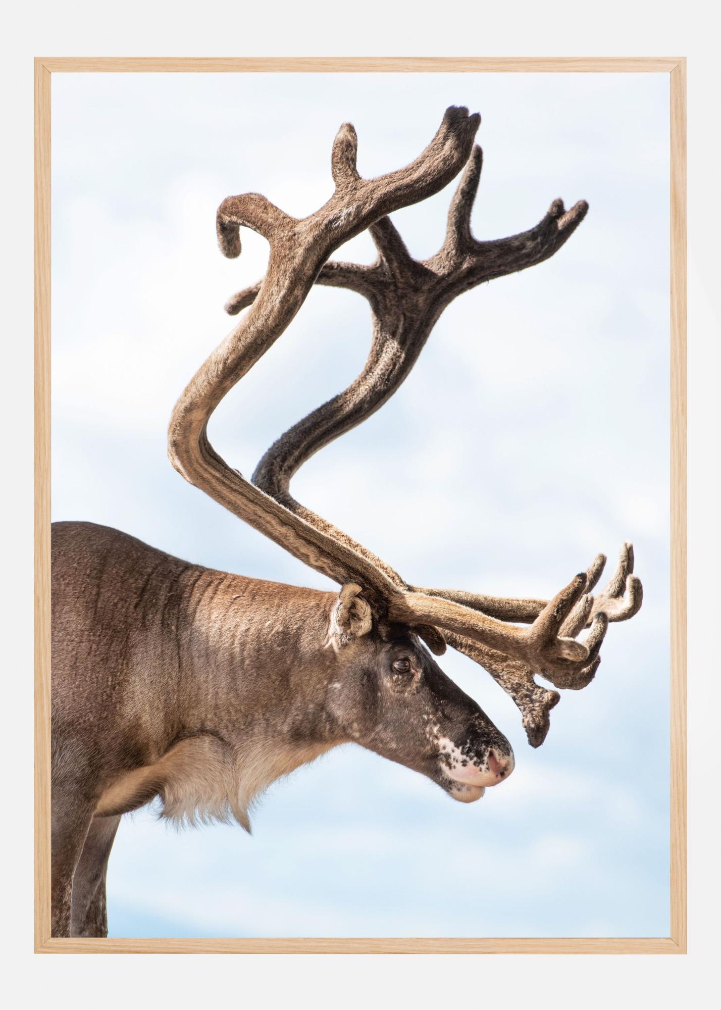 Šiame motyve vaizduojamas didingas elnias profiliu su įspūdingais, išsišakojusiais ragais prieš švelnų ir šviesų dangų. Nuotrauka perteikia gamtos įkvėptą, šiaurietišką nuotaiką, todėl puikiai tinka kaip plakatas ar afiša svetainėje, miegamajame ar kalnų namelyje. Detalus fotografijos stilius suteikia laukinės gamtos, ramybės ir stiprybės pojūtį – tai akivaizdus pasirinkimas mėgstantiems gyvūnų motyvus, skandinavišką dizainą ir madingus gamtos atspaudus.