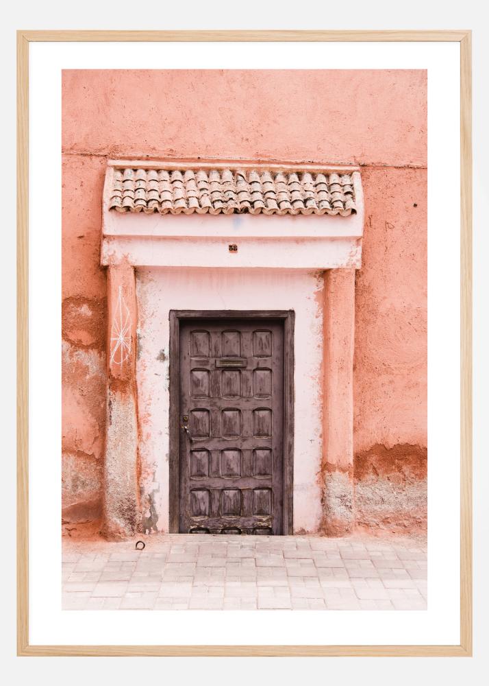 Gražus persiko ir rudos spalvos atspaudas su rudos medinės durimis. Marokietiški namai nudažyti gražiu persiko tonu. Balta siena, kuri supa duris, suteikia papildomą šviesos akcentą portretui. Pakabinkite šį gražų persiko spalvos plakatą ant smėlio spalvos sienos, kad sukurtumėte harmonijos jausmą.