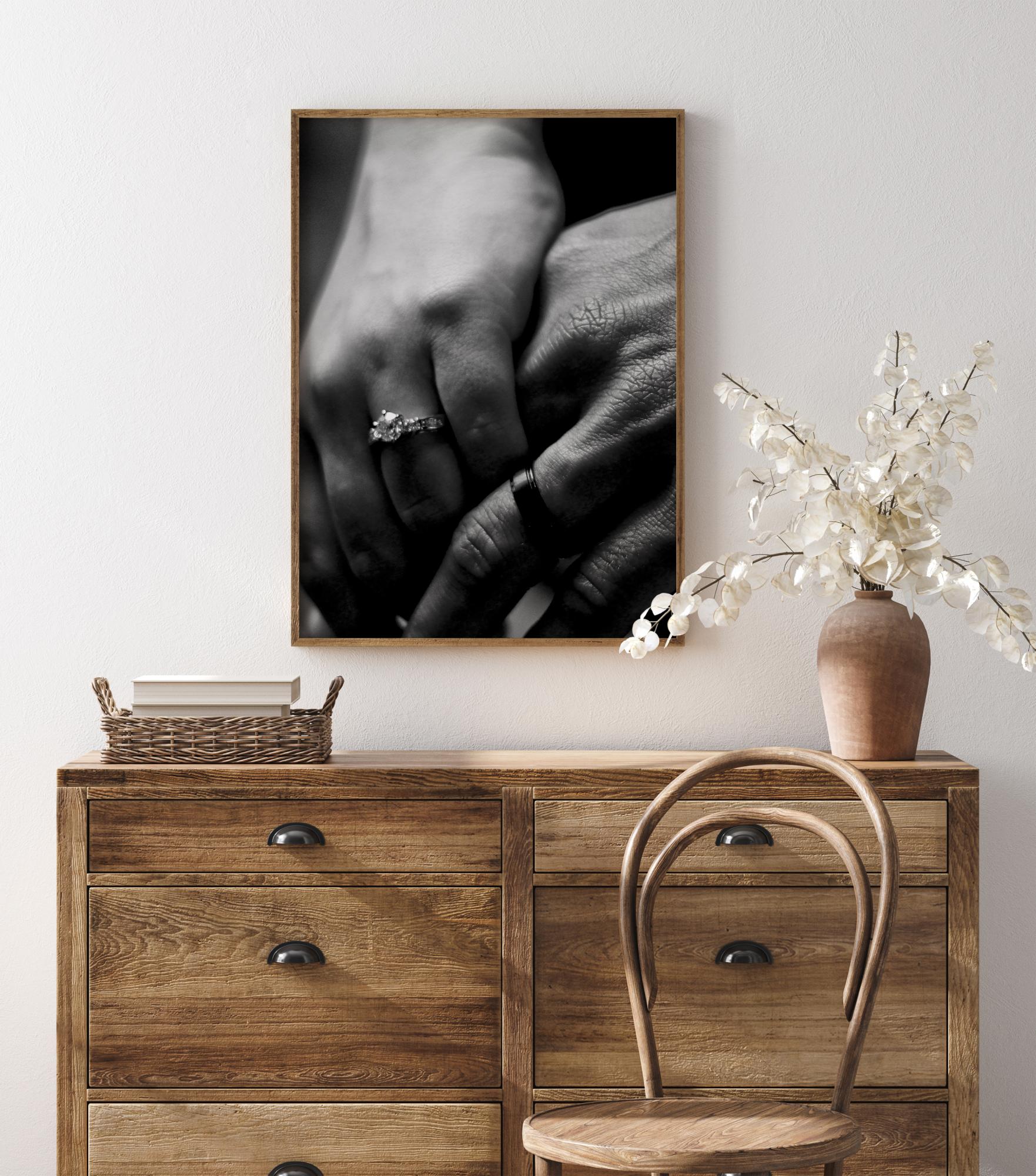 Romantiškas juodai baltas spaudinys, vaizduojantis du rankas su žiedais. Stiprus ir emocingas vaizdas tamsiame fone. Natūrali šviesa šviečia ant mažo deimanto formos žiedo. Romantiškas plakatas, kurį galite pakabinti ant sienos miegamajame.