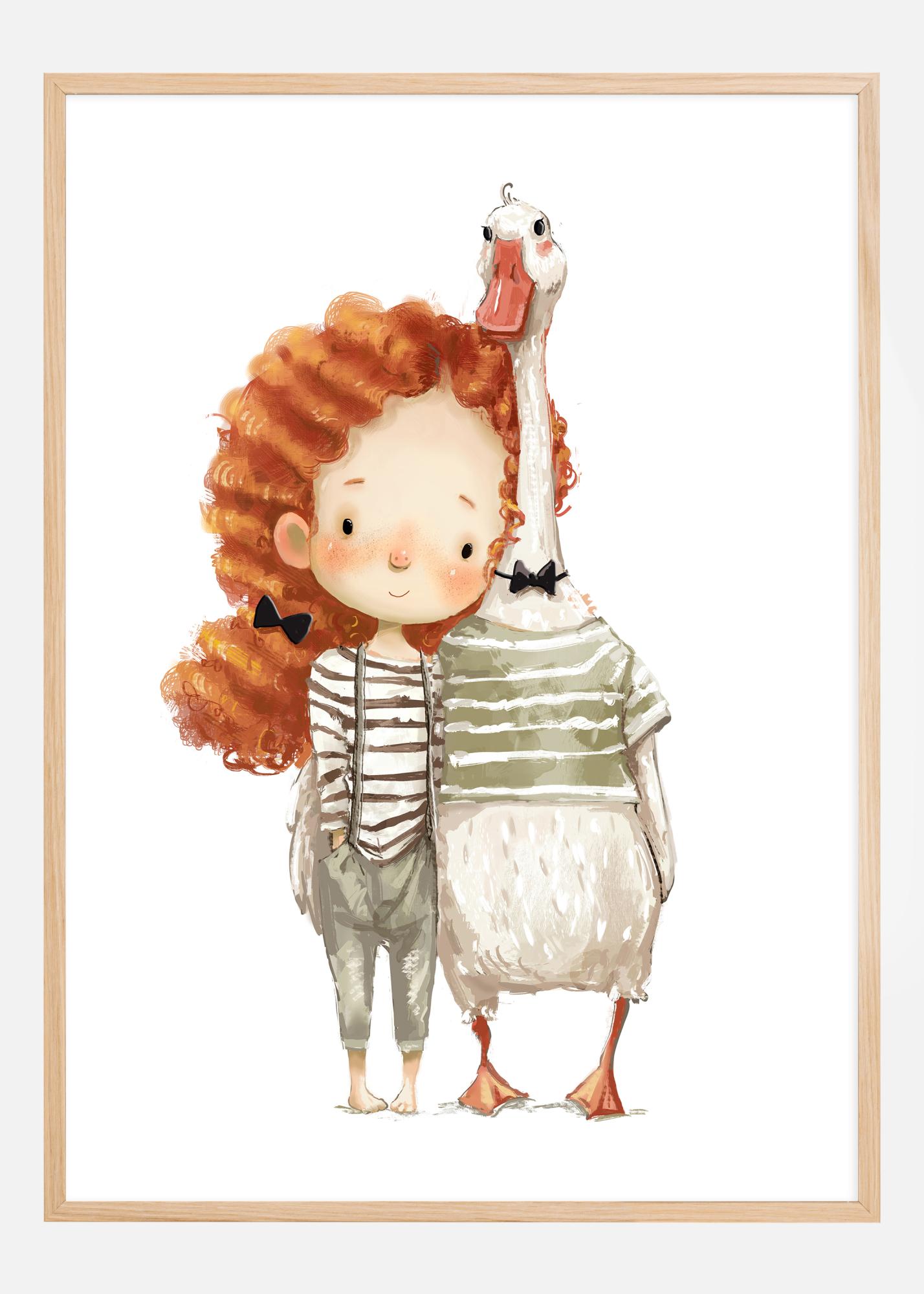 Šis žaismingas ir širdžiai mielas plakatas vaizduoja jauną mergaitę su gyvybingomis, raudonomis garbanomis, stovinčia šalia savo ištikimo bendrininko – didelės anties. Jie dalinasi šilta ir linksma akimirka kartu, kuri yra užfiksuota švelniais, šiltais akvarelinės tapybos tonais. Žavi pora, su mergaitės raudonais skruostais ir ančio smalsia akimi, spinduliuoja draugyste ir džiaugsmu.