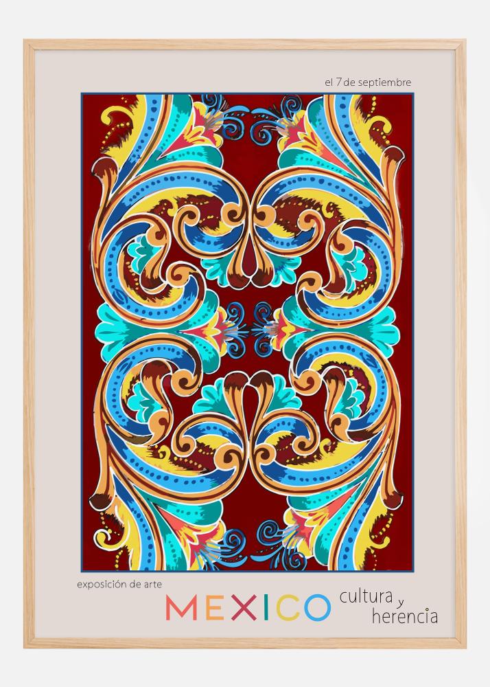 Šis gyvas ir spalvingas plakatas švenčia meno parodą Meksikoje. Jo dizainas įkvėptas tradicinių meksikietiškų raštų, pilnas vingiuojančių kreivių ir puošnių gėlių motyvų, kurie kviečia akį šokti per vaizdą. Turtingos raudonos, geltonos ir mėlynos spalvos yra būdingos meksikiečių liaudies menui ir simbolizuoja tautos kultūrą ir paveldą su moderniu posūkiu.