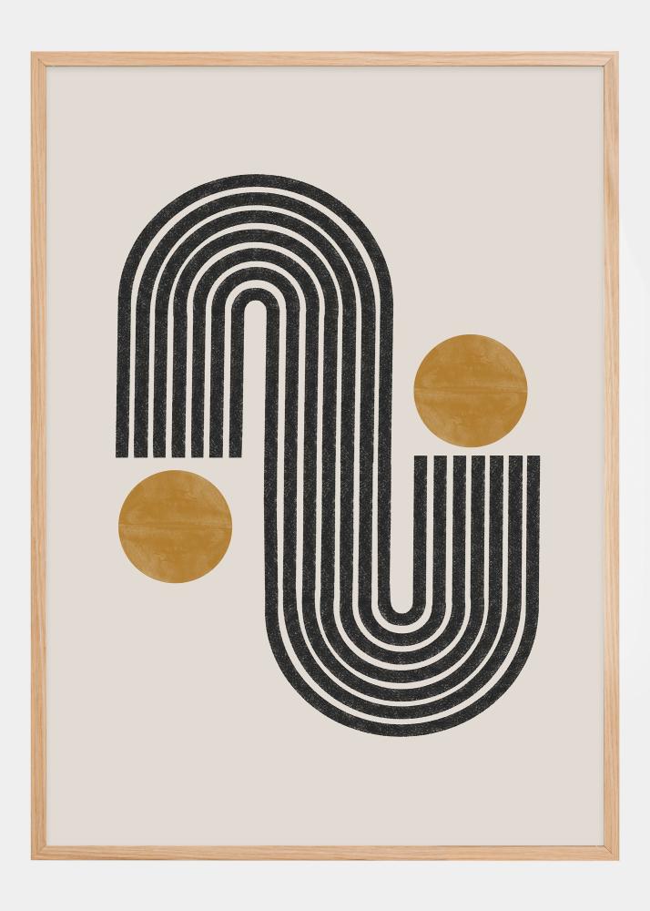 Atraskite stilingo grožio pasaulį su mūsų plakatu, kuris išryškina kontrastus tiek forma, tiek spalva. Šis spaudinys rodo dinaminį juodai baltą linijų raštą, formuojantį švelniai lenktą formą, subalansuotą su dviem ochros spalvos apskritimais, kurie suteikia šiltą ir žemišką jausmą. Šis minimalistinis, tačiau įspūdingas dizainas yra įkvėptas vidurio amžiaus modernios estetikos ir siūlo ramybės bei pusiausvyros pojūtį bet kokioje patalpoje, kurioje jis yra padėtas.