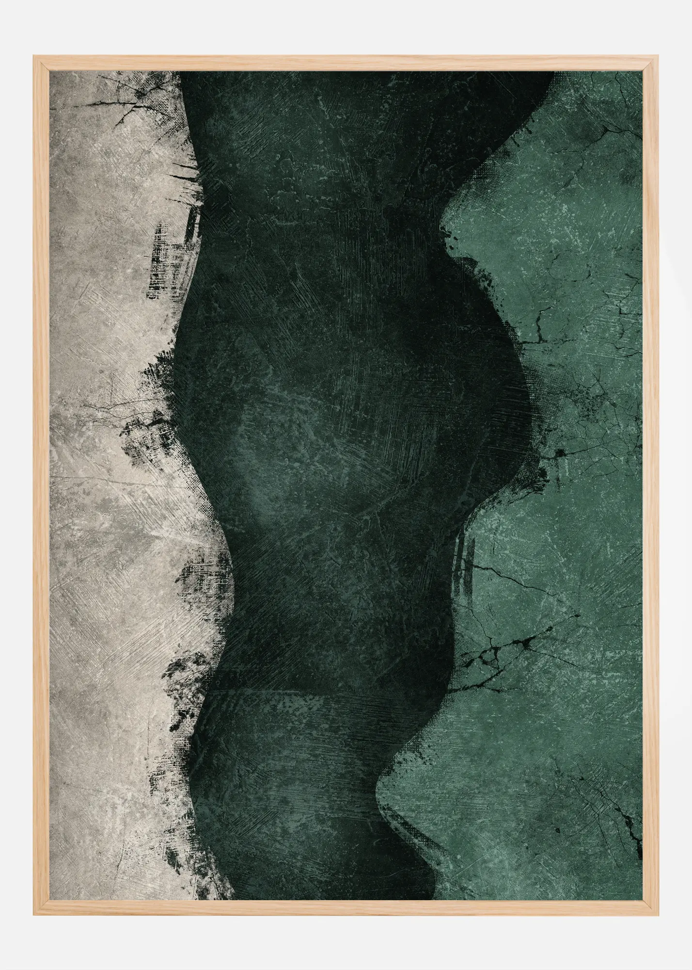 Plakato tekstūra ir spalvų pasirinkimas sukuria mistikos ir nežinomų gelmių atmosferą. Drąsios, organinės formos susijungia su žaliu ir nereguliariu pojūčiu, suteikdamos įspūdį natūralaus proceso ar geologinės formacijos. Šis meno kūrinys galėtų būti skirtingų elementų sugyvenimo ar kovos metafora, puikus vaizdas įkvėpti pokalbiams ir apmąstymams. Ši spauda yra puikus pasirinkimas namams ar biurui, kur norima įvesti šiuolaikinį stilių su jausmu dėl gamtos negailestingos jėgos ir grožio.