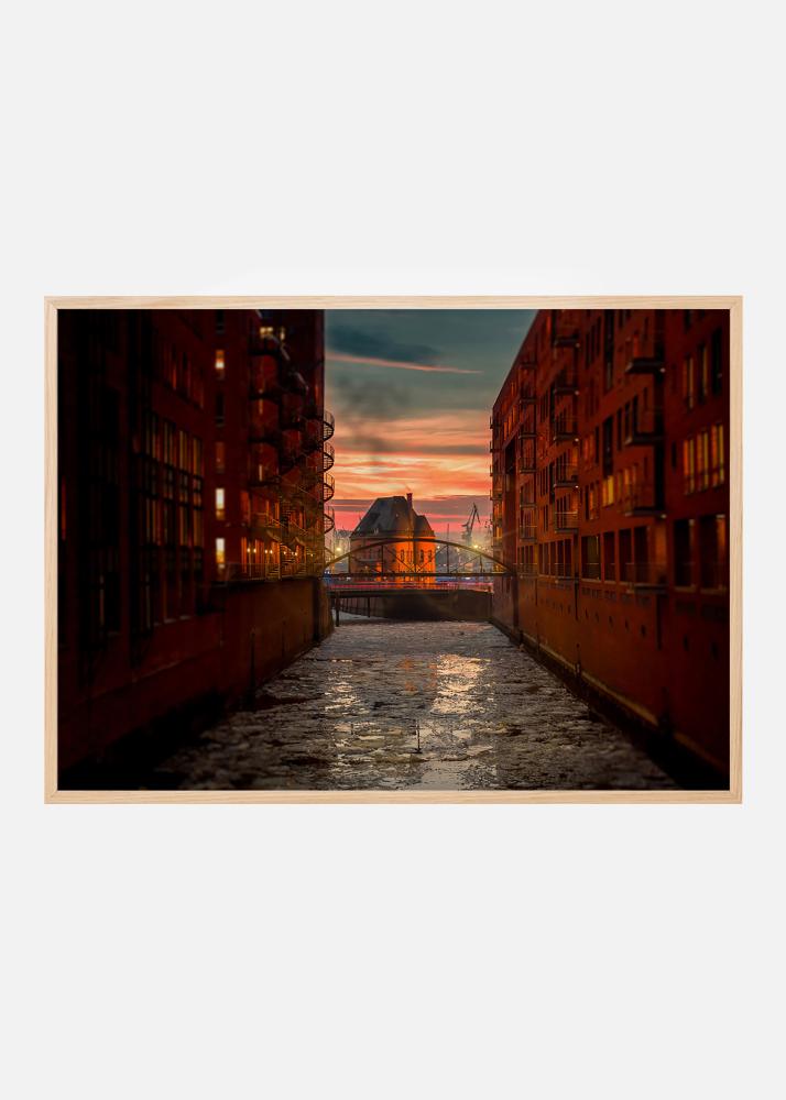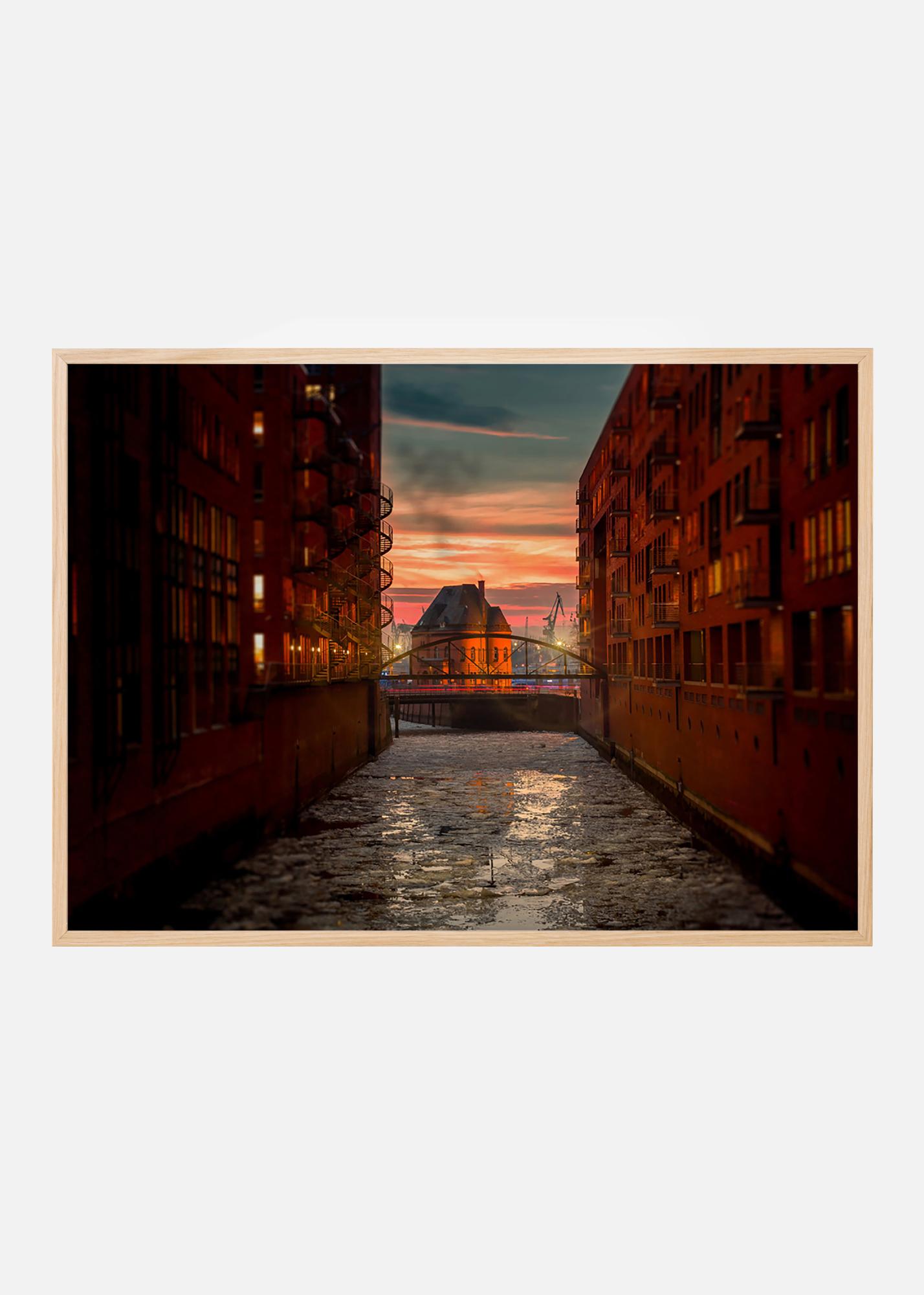 Saulėlydis virš senojo sandėlių rajono Speicherstadt Hamburge su savo kanalais ir neogotikiniais plytiniais pastatais. Nuotrauka iš saugomo architektūrinio paveldo srities puikiai tinka žmogaus, besidominančio architektūra arba istorija, namuose. Plakatas geriausiai atrodys plonoje metalinėje rėmoje, kuri dera su griežta architektūra ir atrodo gražiai ant sienos kartu su kitais miesto vaizdais.