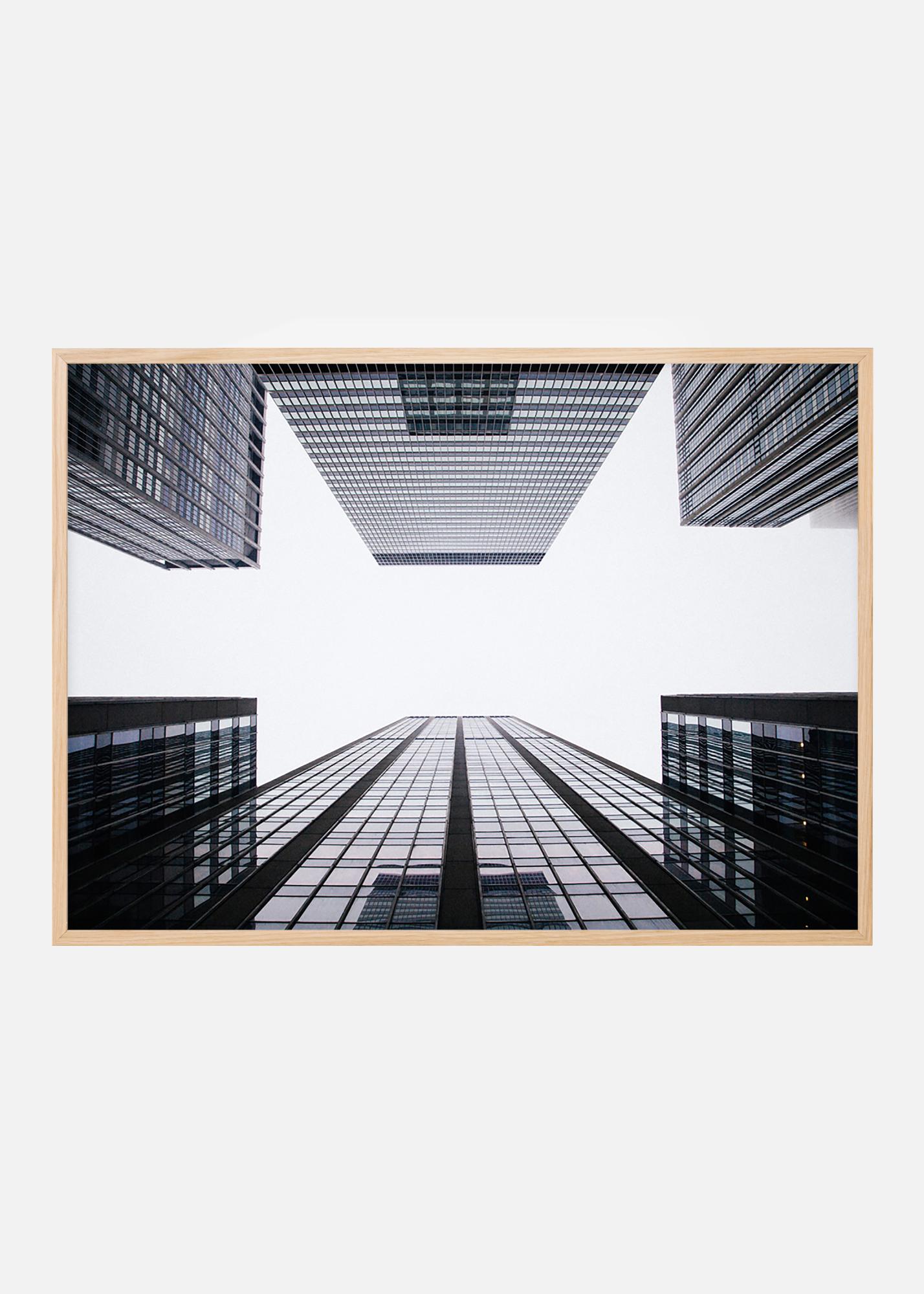 Architektūros plakatas su augančiais dangoraižiais prieš debesų baltumo dangų. Stilingas vaizdas su tamsiais pastatais prieš baltą foną, su dangaus atspindžiais stiklo langeliuose. Puiki dovana mėgstančiam grafinius pastatų portretus. Spausdinta puikiai tiks juodame rėme, kuris sustiprina tamsą vaizde bei gražiai dera su kitomis architektūros fotografijomis.