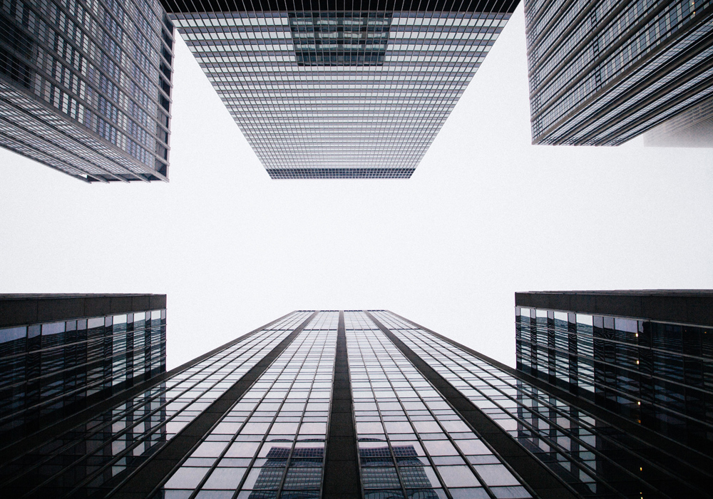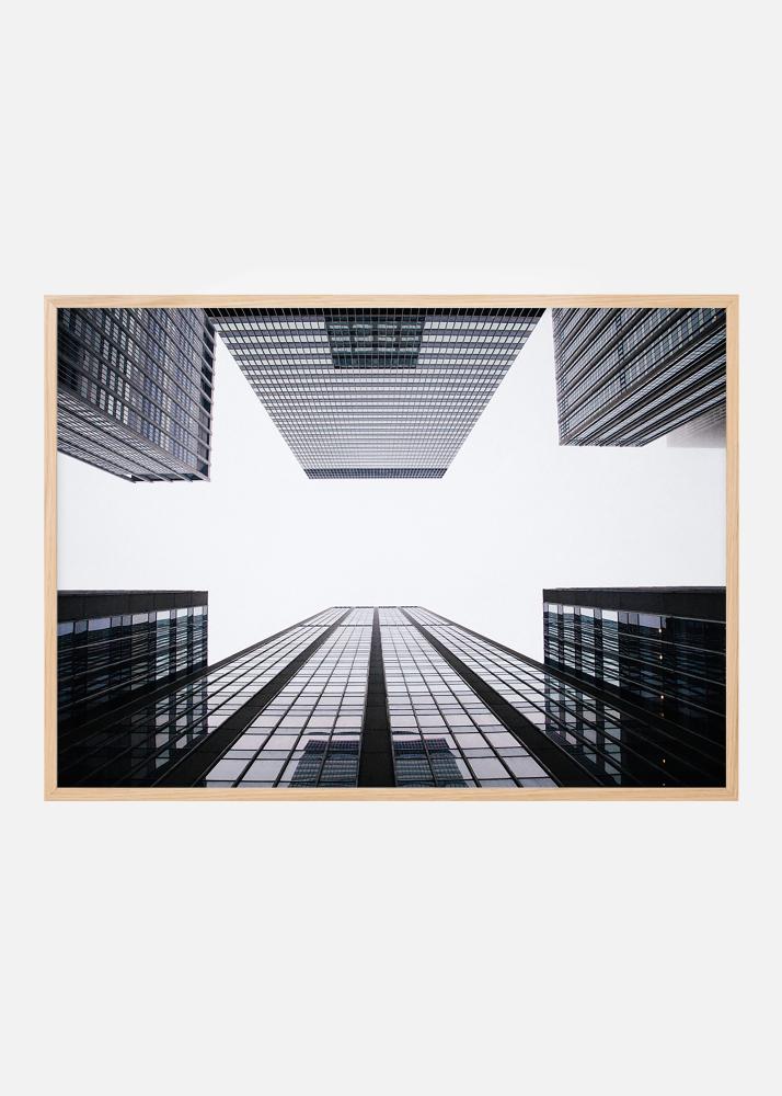 Architektūros plakatas su augančiais dangoraižiais prieš debesuotai baltą dangų. Elegantiškas vaizdas tamsių pastatų prieš baltą foną, su dangaus atspindžiais stikluose. Tobula dovana tam, kuris mėgsta grafinius pastatų portretus. Spaudinys puikiai atrodo juodame rėmelyje, sustiprinančiame tamsą paveiksle ir dera su kitomis architektūros fotografijomis.
